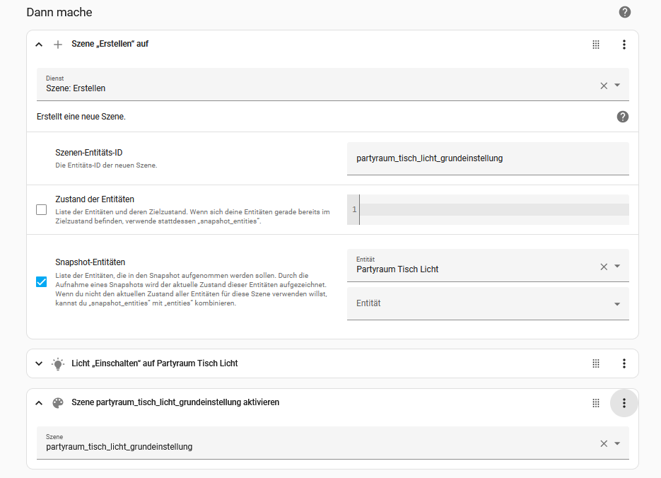 Eine Sache habe ich nun noch. Irgendwie werden die Einstellungen der “Birne” nicht in der Szene gespeichert (Snapshot-Entitäten). So kommt es mir zumindest vor. Gibt es da ggf. bekannte Probleme mit IKEA “Birnen”?