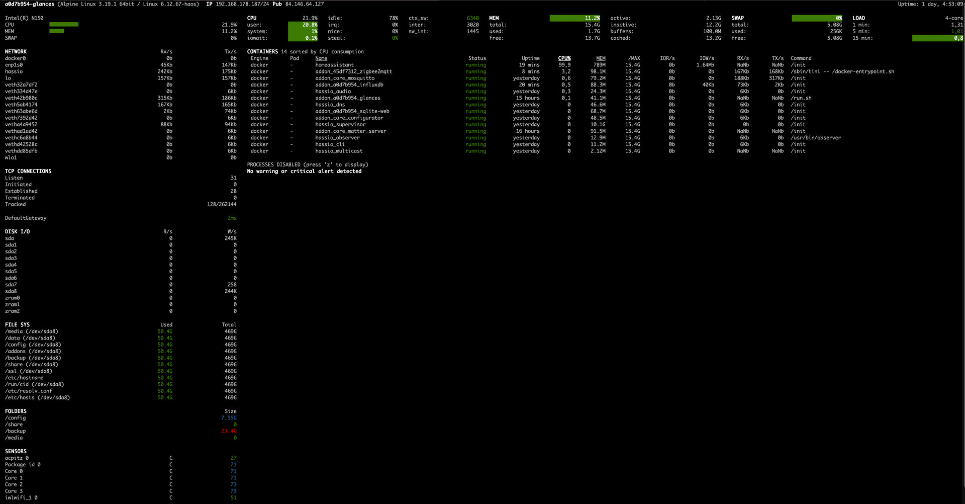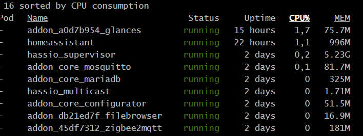 Ich habe mit glances mal nach geschaut → die CPU läuft dauerhaft um die 20% und der Hauptteil wird durch Home Assistant selbst verursacht. Die Addons verbrauchen fast nichts.