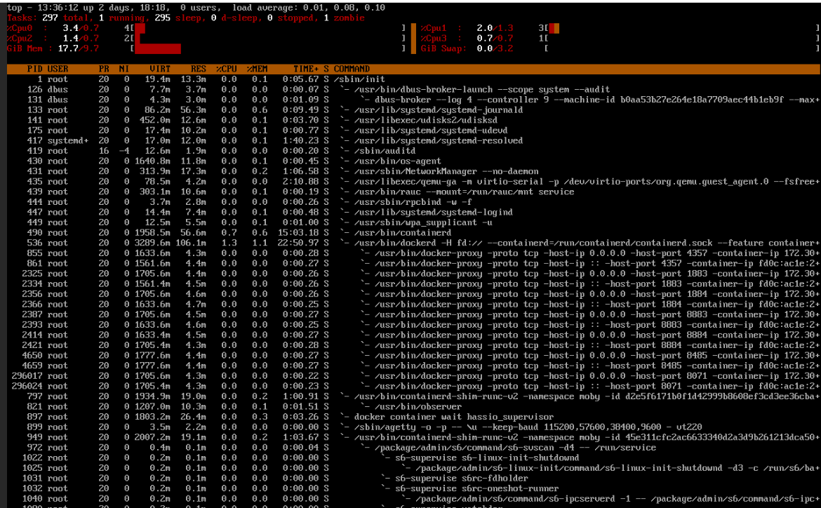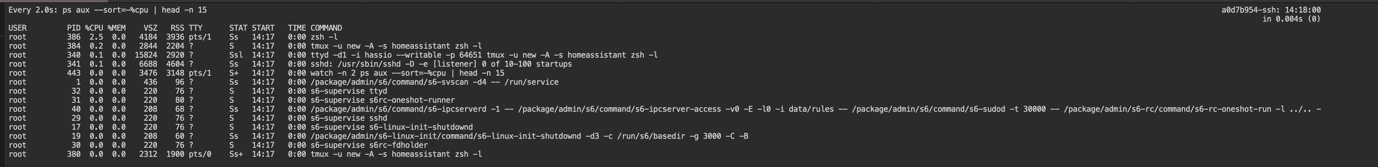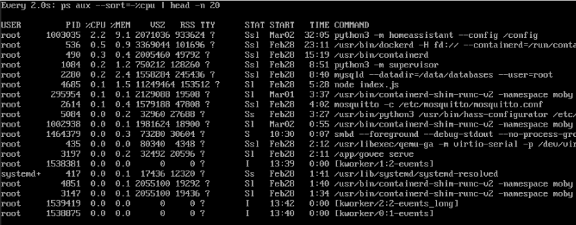 Ich habe noch etwas herumprobiert und möchte Dir diesen Befehl nahe legen → auf der HA Console nach login watch -n 2 "ps aux --sort=-%cpu | head -n 15"