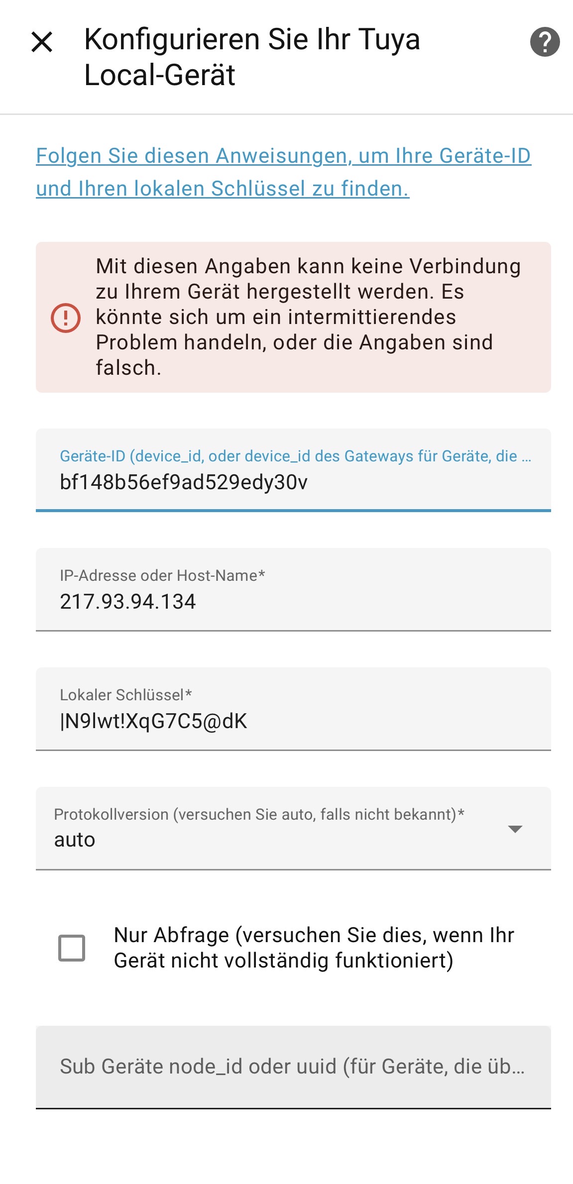 Wenn man die Smart+ App von Ledvance/OSRAM nutzt, bekommt man alle Infos, wie sie in deinem Screenshot gezeigt werden für die manuelle Einrichtung in Local Tuya bereits ausgegeben, ohne irgendwelche Umwege über einen Entwickleraccount, Python-Scripte etc. Lediglich die IP stimmt nicht. Es muss natürlich eine lokale Netzwerk-IP sein, beginnend mit 192…