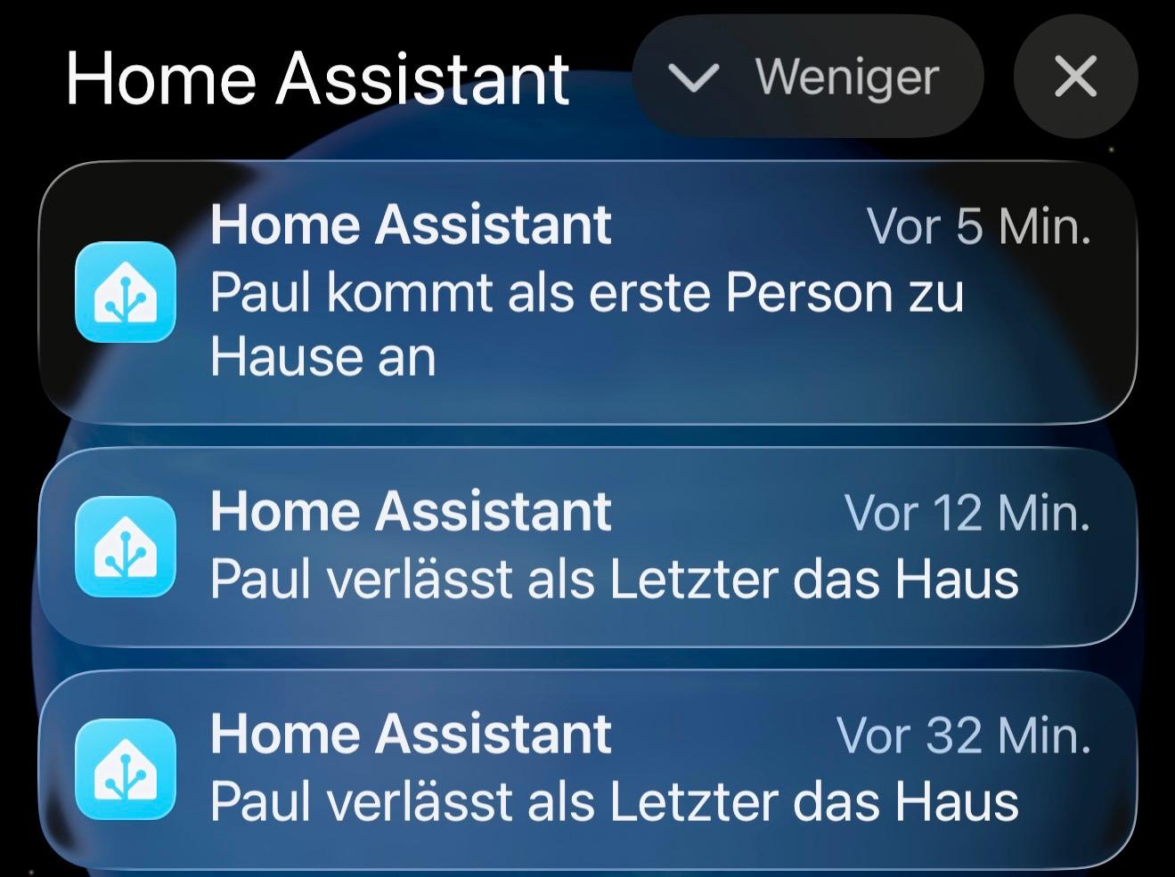 Im immerwährenden Geplänkel zwischen mir und dem Sohnemann, wer denn nun die bessere Smart Home Lösung hat, fehlen mir immer dann die Argumente, wenn er mir in Apple Home die Trigger “Wenn die letzte Person das Zuhause verlässt.” oder “Wenn die erste Person zu Hause ankommt“ vorführt. Auch mit viel KI und RTFM, kriege ich keine hstabile Lösung hin.