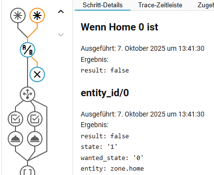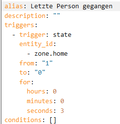 Wenn die letzte Person das Haus verlässt, ist der zone.home Wert gerade noch bei 1. Damit wird die Bedingung “false” und die Automation wird beendet. Machst du ähnliche Erfahrungen?