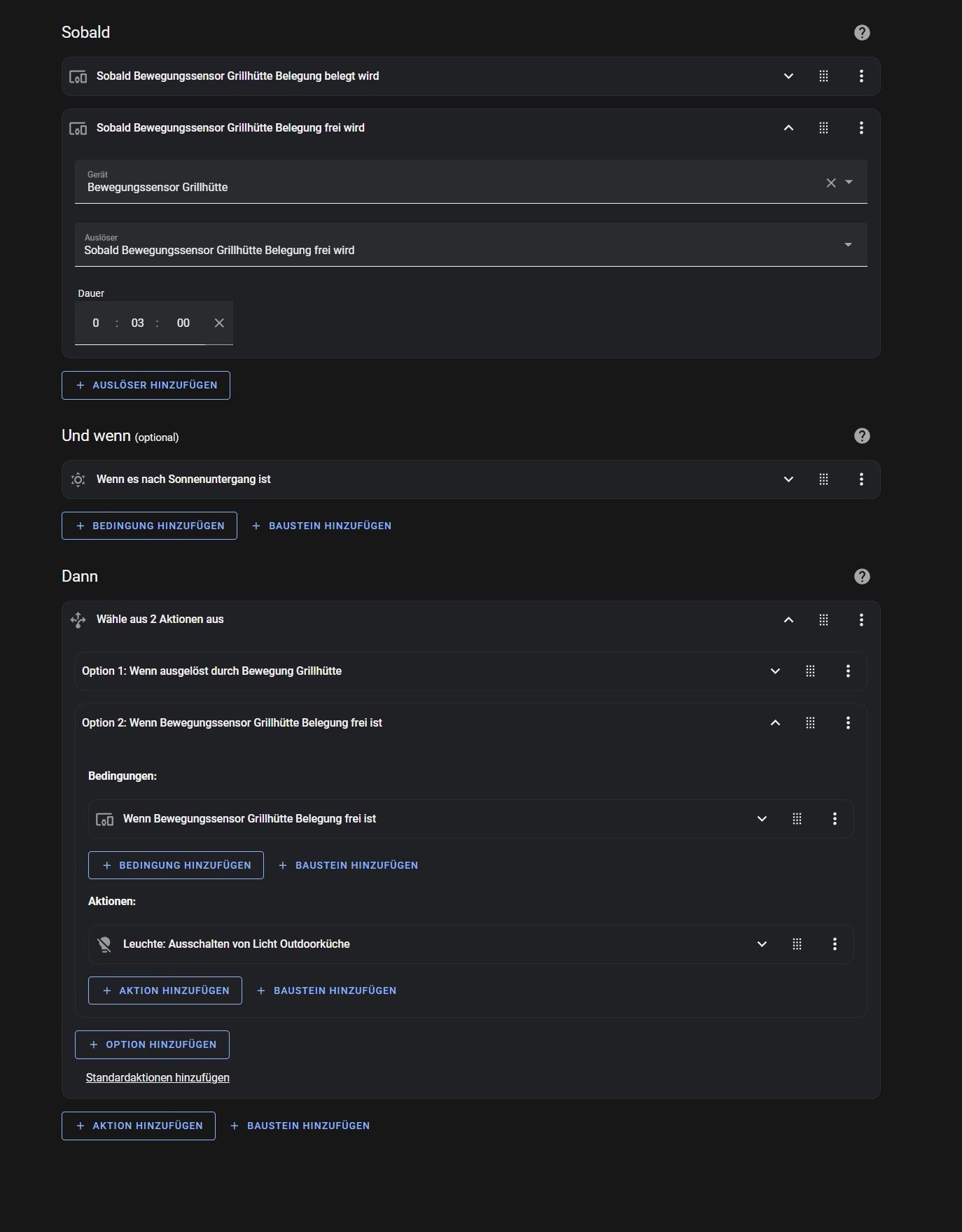 Ja, das wäre eine Option, wenn ihr euch in der Grillhütte so “wenig” bewegt, dass der Bewegungsmelder das nicht mehr registriert. Setzt aber voraus, dass der Lichtschalter erreichbar ist, bevor die Automation auslöst. Sonst löst die Automation aus und @andy_wna schaltet dann das Licht wieder aus .