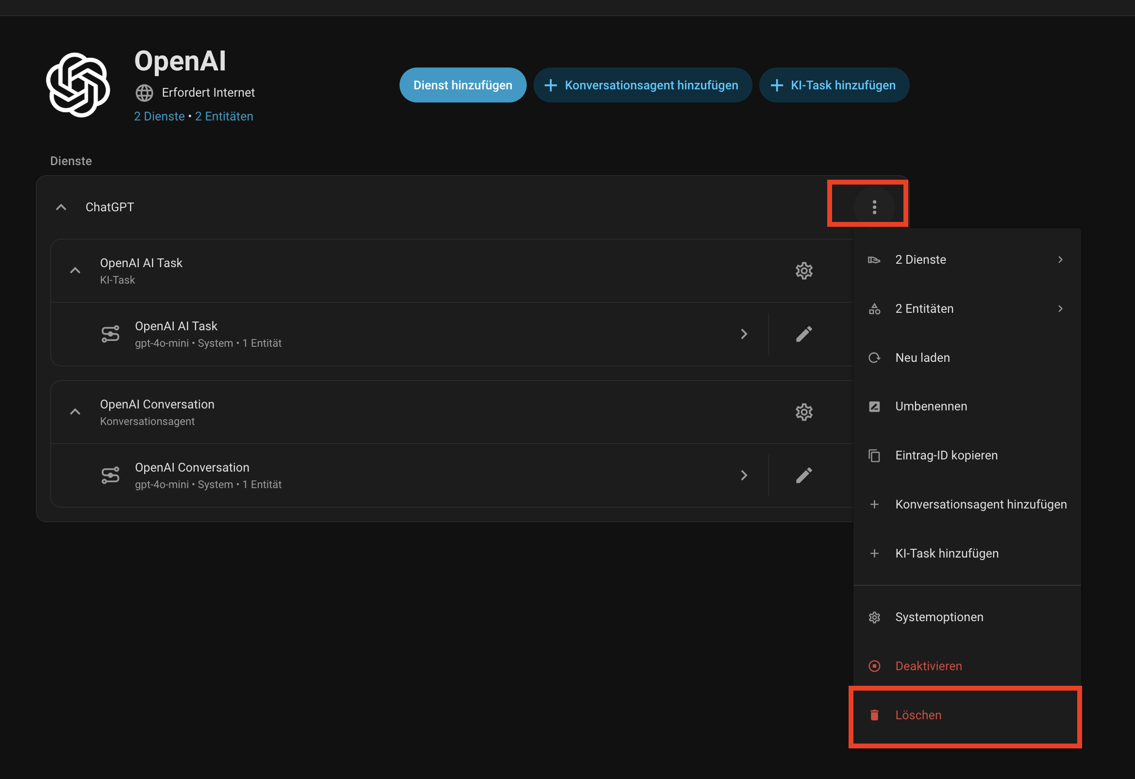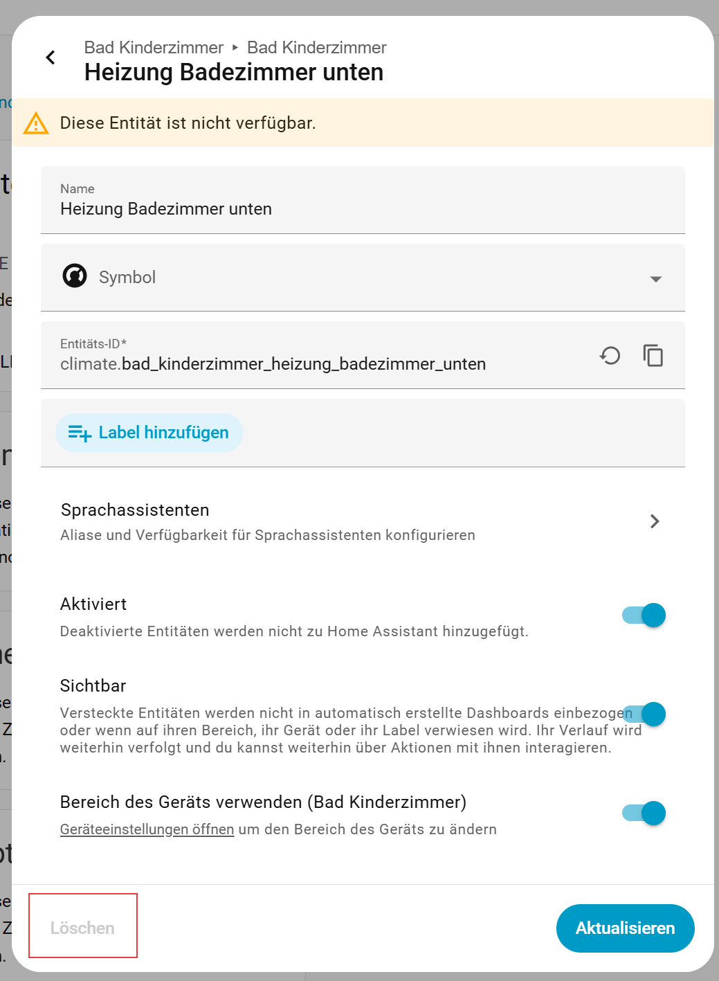 Ich finde aber keine Möglichkeit, diese Geräte und die Integration zu löschen. Ich kann die Geräte überall nur deaktivieren, was ich bereits gemacht habe.