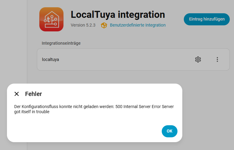 Leider scheitere ich im Moment an der “LocalTuya Integration”. Die “eigentliche Integration” incl. Verknüpfung mit meinem Tuya Developer Account habe ich mit Hilfe des “Simon42 Videos” geschafft und auch eine Bestätigung der erfolgreichen Installation bekommen. Ich kann jedoch keines meiner Tuya Geräte (Lampen) installieren, d.h. mir werden keine “konfigurierbaren Geräte” angezeigt. Stattdessen bekomme ich diese Meldung: