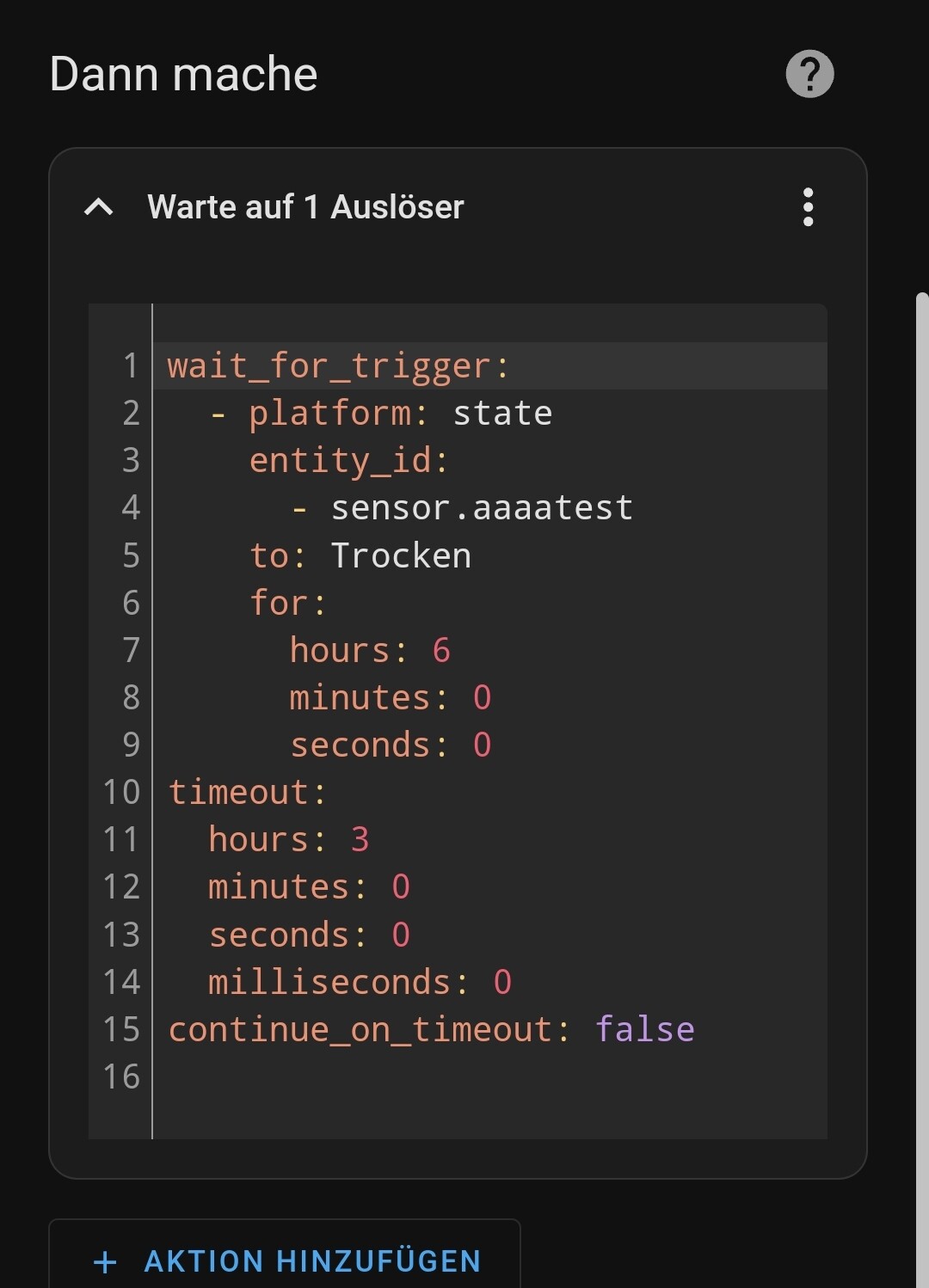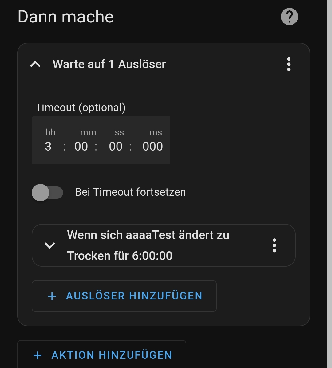 Warte auf Auslöser (Timeout 3h) = Trocken für 6h (brauchst du nicht, wenn du mit mehreren Triggern arbeitest)