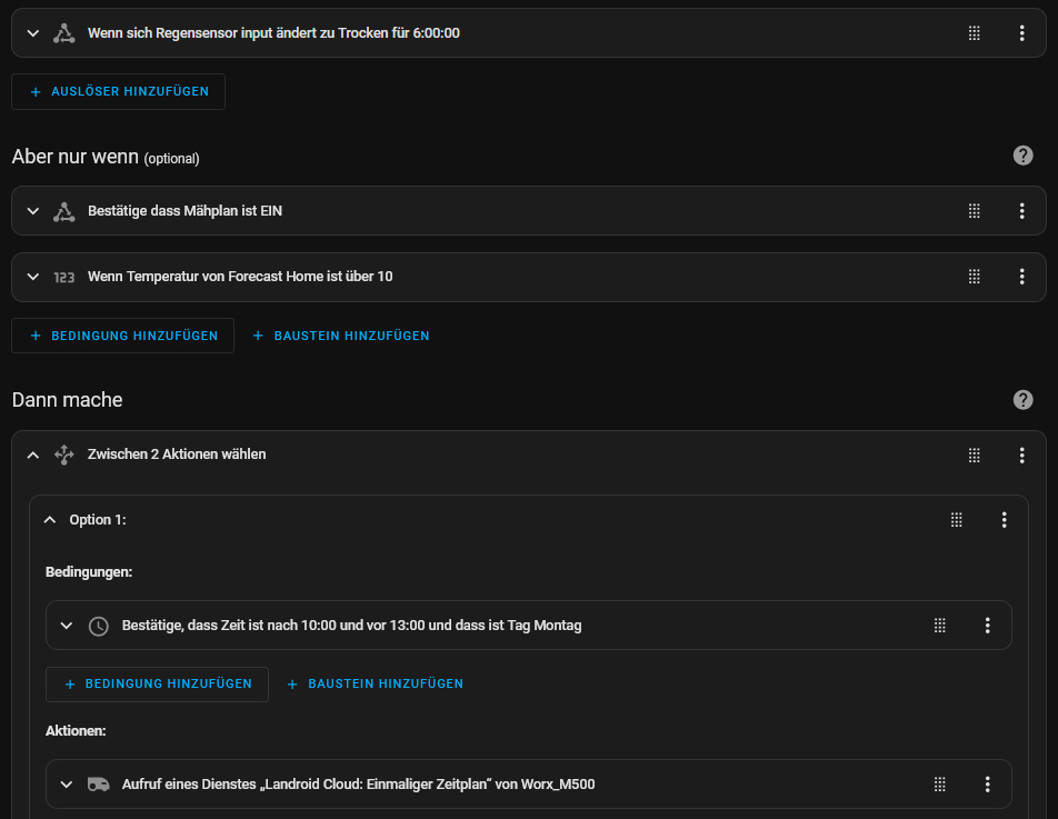 Kommt die “trocken” Meldung des Regensensors aber erst 2 Stunden später, startet der Mähvorgang nicht, weil der Trigger ja nicht erneut ausgelöst wurde.