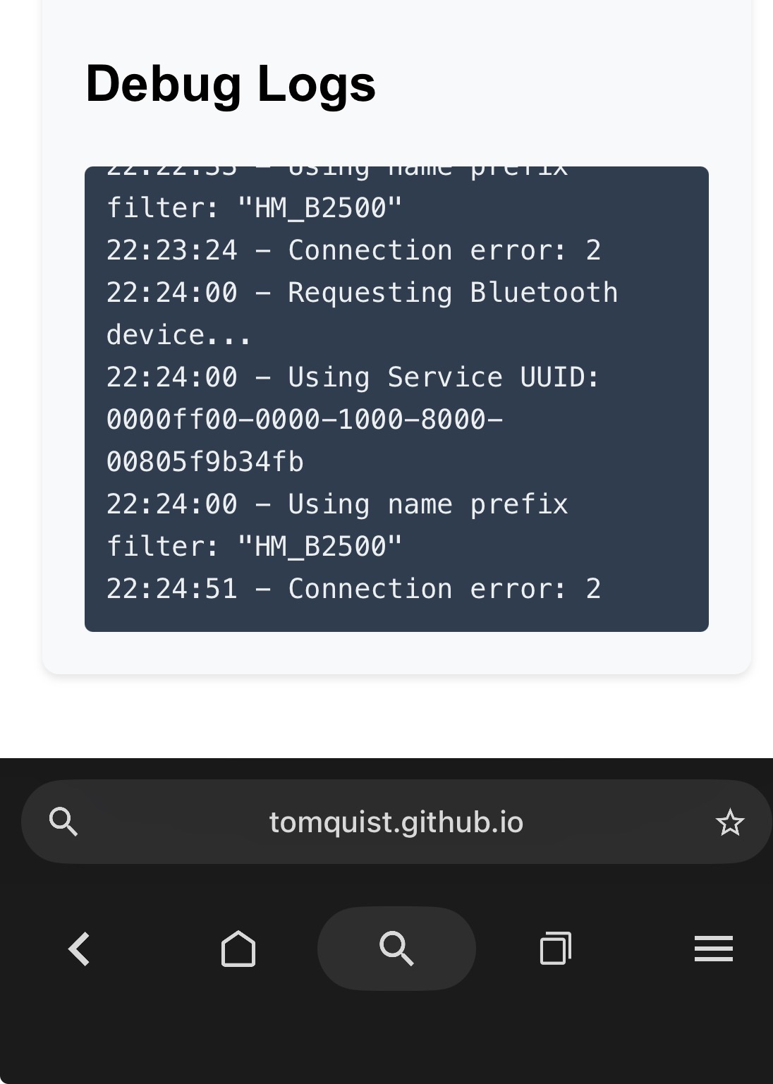 Beim Versuch Verbindung zum Marstek via Bluetooth (Bluefy Iphone; Bluetooth zum Marstek besteht) herzustellen, um dieses: https://tomquist.github.io/hame-relay/b2500.html, wie von Simon beschrieben auszuführen, bekomme ich unten stehende Fehlermeldung.