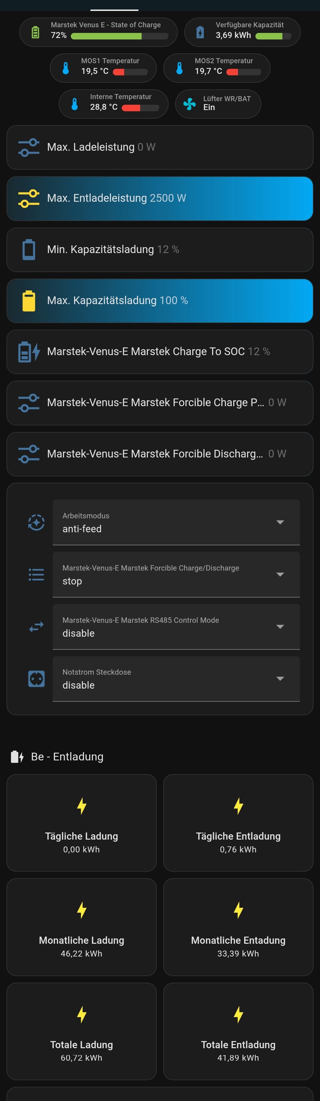 Eine Frage, welche der drei “marstek_venus_battery_control.yaml” Dateien hast du benutzt für den Venus E? Der Unterschied hat sich mir noch nicht ganz erschlossen, und mir fehlt bei der ersten Beobachtung der kWh Wert für die Batterie.