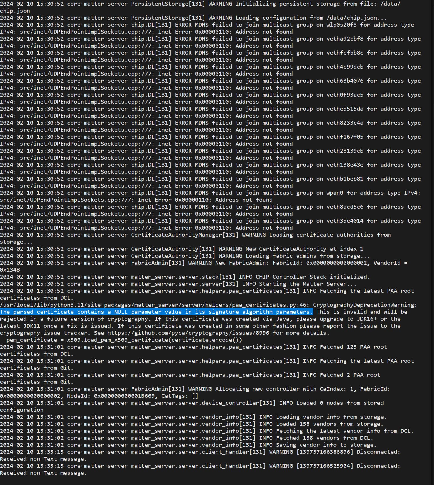 2024-02-10 04:02:14 core-matter-server matter_server.server.device_controller[126] INFO Node 1 discovered on MDNS