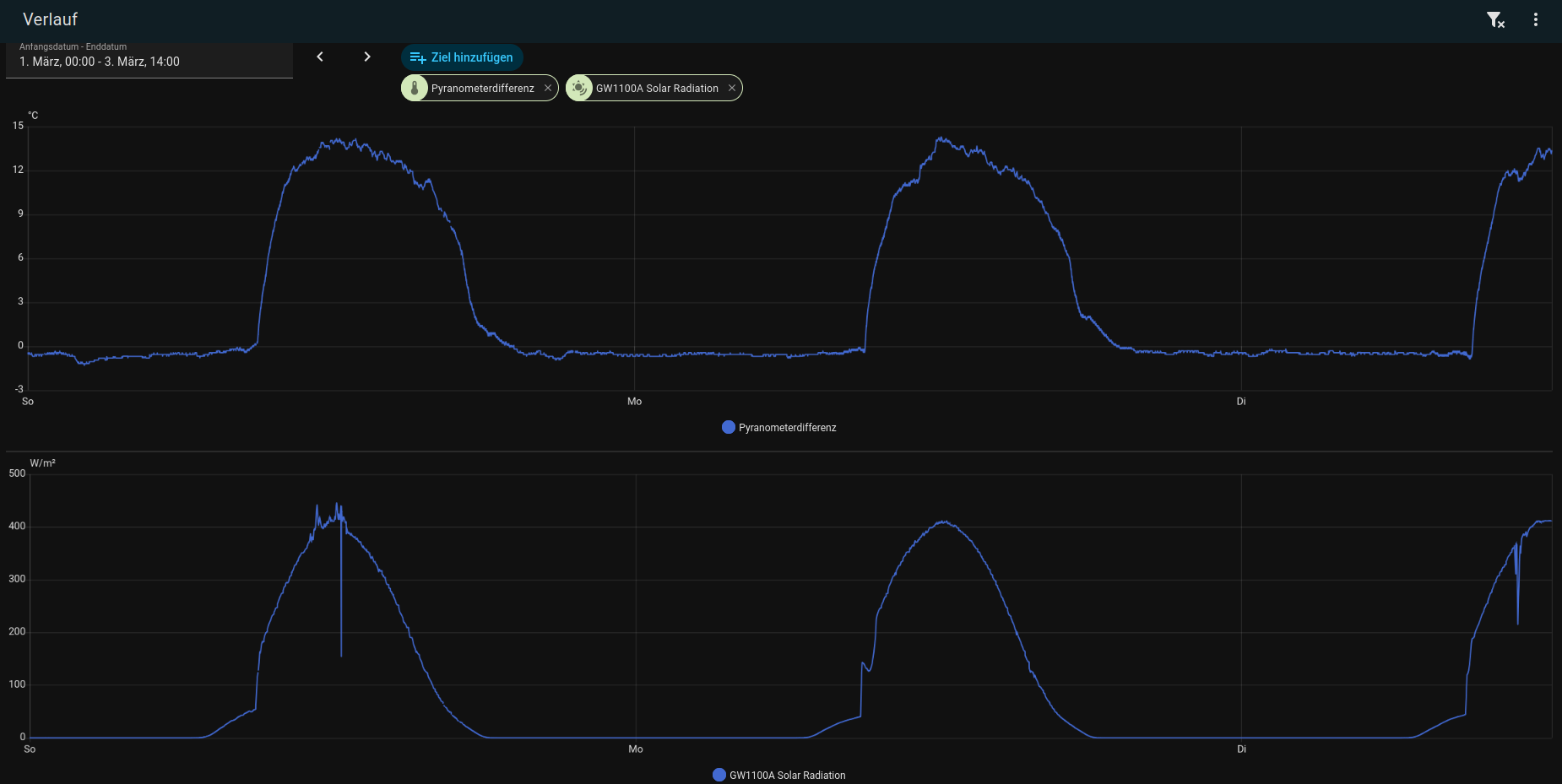 Hier mal der Unterschied zwischen meinem thermischen Pyranometer (Eigenbau) und der Ecowitt Solarstrahlung von meinem Standort.