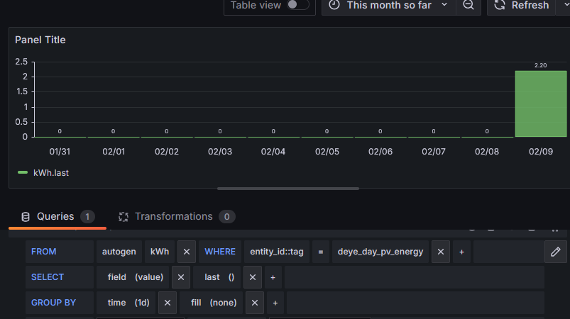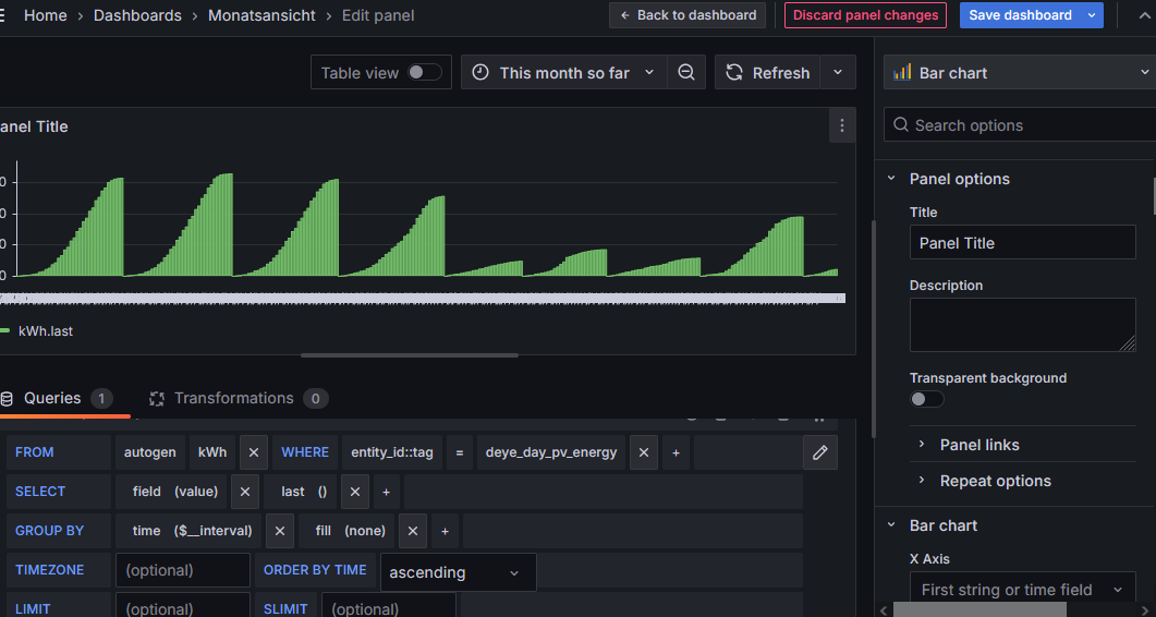 ich versuche aktuell vergebens ein Balkendiagramm zu erstellen, das mir für einen Monat pro Tag den PV Ertrag anzeigt.
