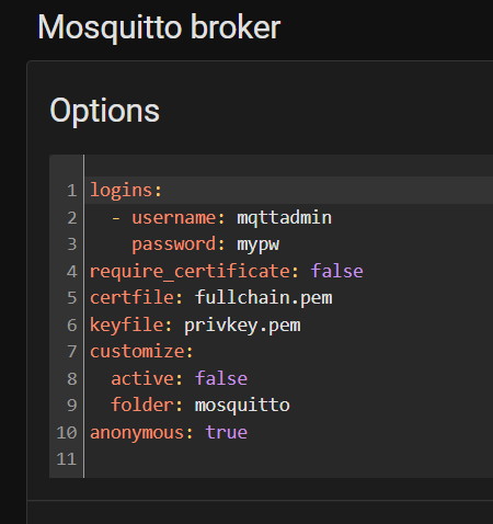 - Im Mosquitto broker in den Optionen die yaml aufrufen und Usernamen und password ergänzen.