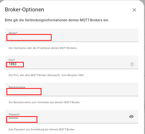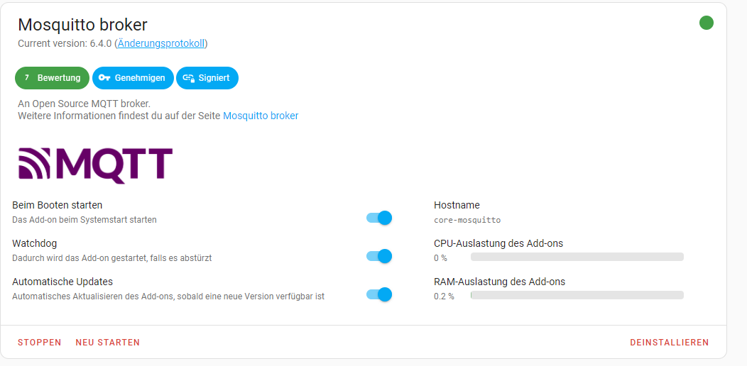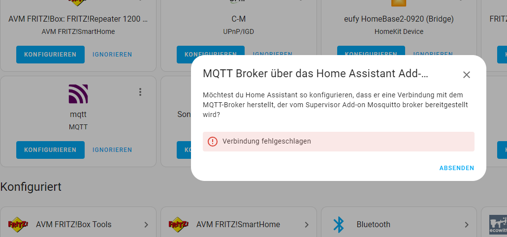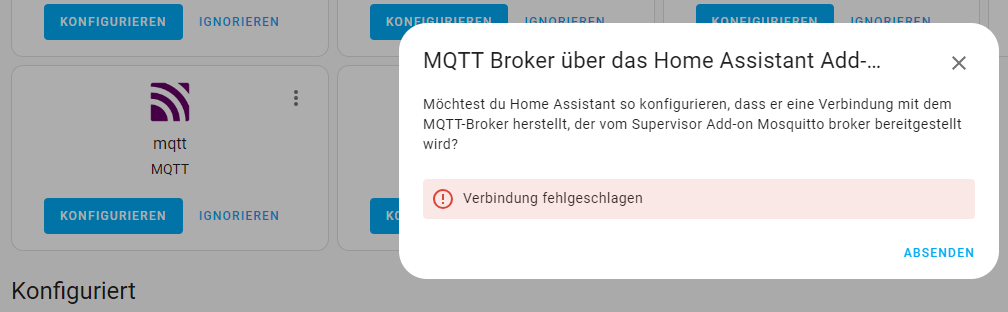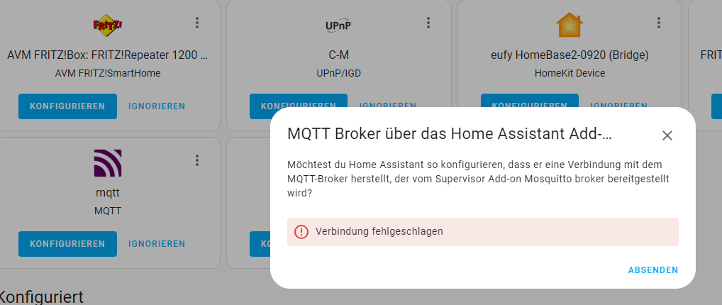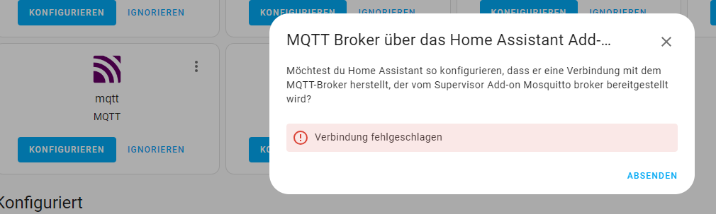 Ja, und wenn ich jetzt bei Einstellungen/ Garäte und Dienste den Mqtt konfigurieren will dann bekomme ich die Fehlermeldung “Verbindung fehlgeschlagen”