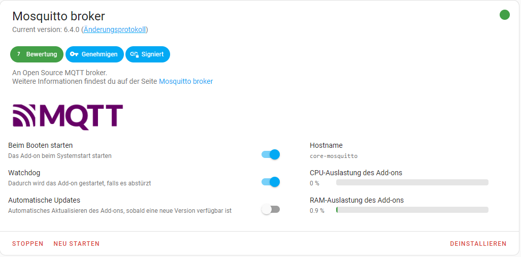 Edit: Eine Anmerkung noch: Wenn man sich irgendwelche Videos oder Infos zu dem Thema MQTT Broker unter HA anschauen und/oder durchlesen sollte, sollten diese Infos nicht zu alt sein. Früher lief die MQTT Broker Installation unter HA mal anders und es musste noch ein User unter dem MQTT Broker selber festgelegt werden. Das ist aktuell bei einer Standardinstallation des MQTT Brokers unter HA nicht mehr notwendig.