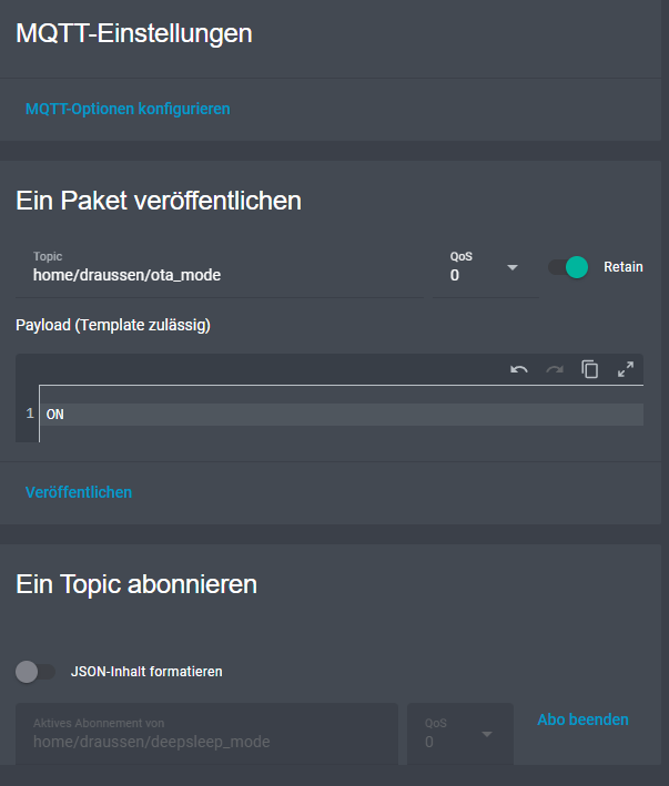 ich habe einen Button angelegt, der eine MQTT Nachricht sendet.