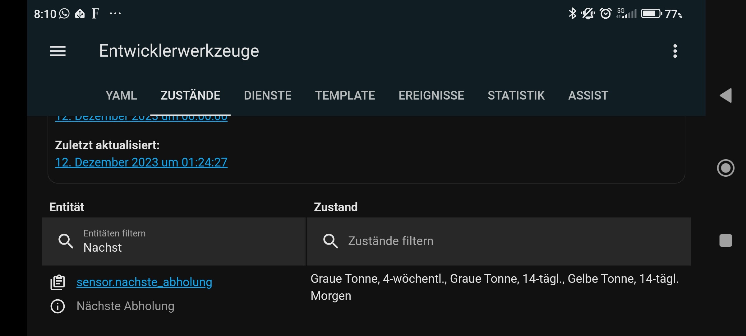 Habe es jetzt mal umgestellt aber der Sensor “Nächste Abholung” stimmt immer noch nicht… und ich finde den Fehler nicht warum Papier und Gelber sack noch immer nicht passen würdest du nochmal drauf schauen bitte?