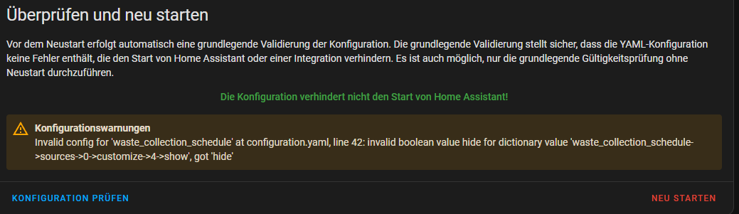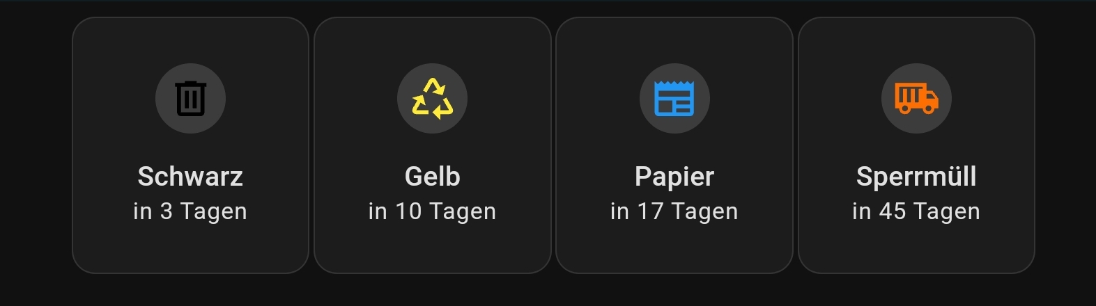 nur mal als Tip, wenn ihr euren Mülltermine als Kalender in HA habt, es gibt eine schöne HACS-Integration, nennt sich “TrashCard” ( benötigt noch Mushroom zusätzlich ), einfacher den Müllkalender integrieren: