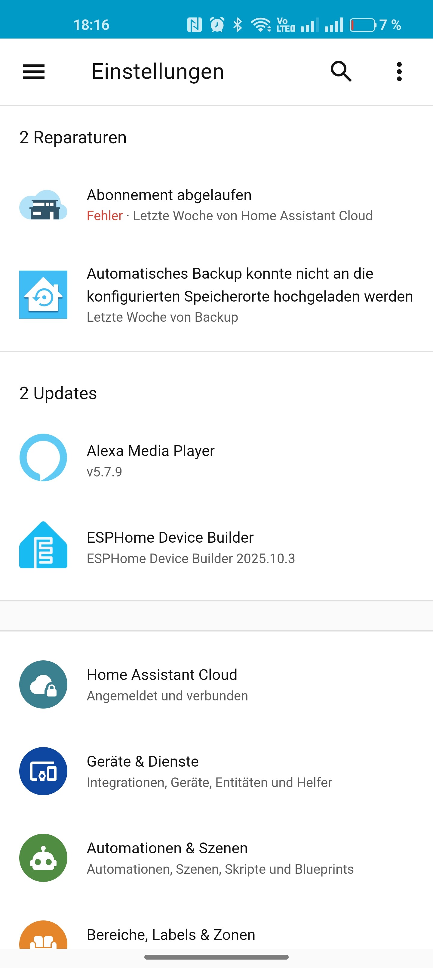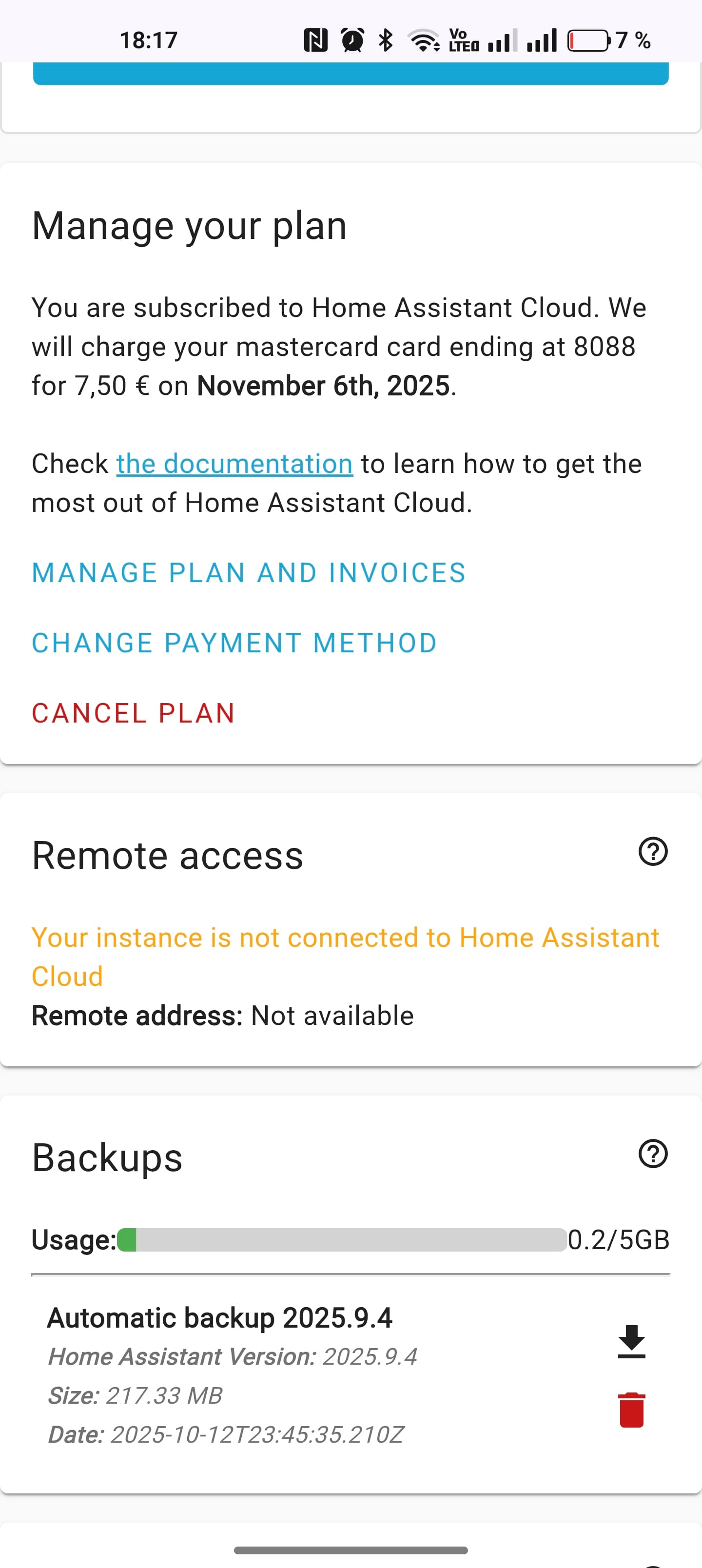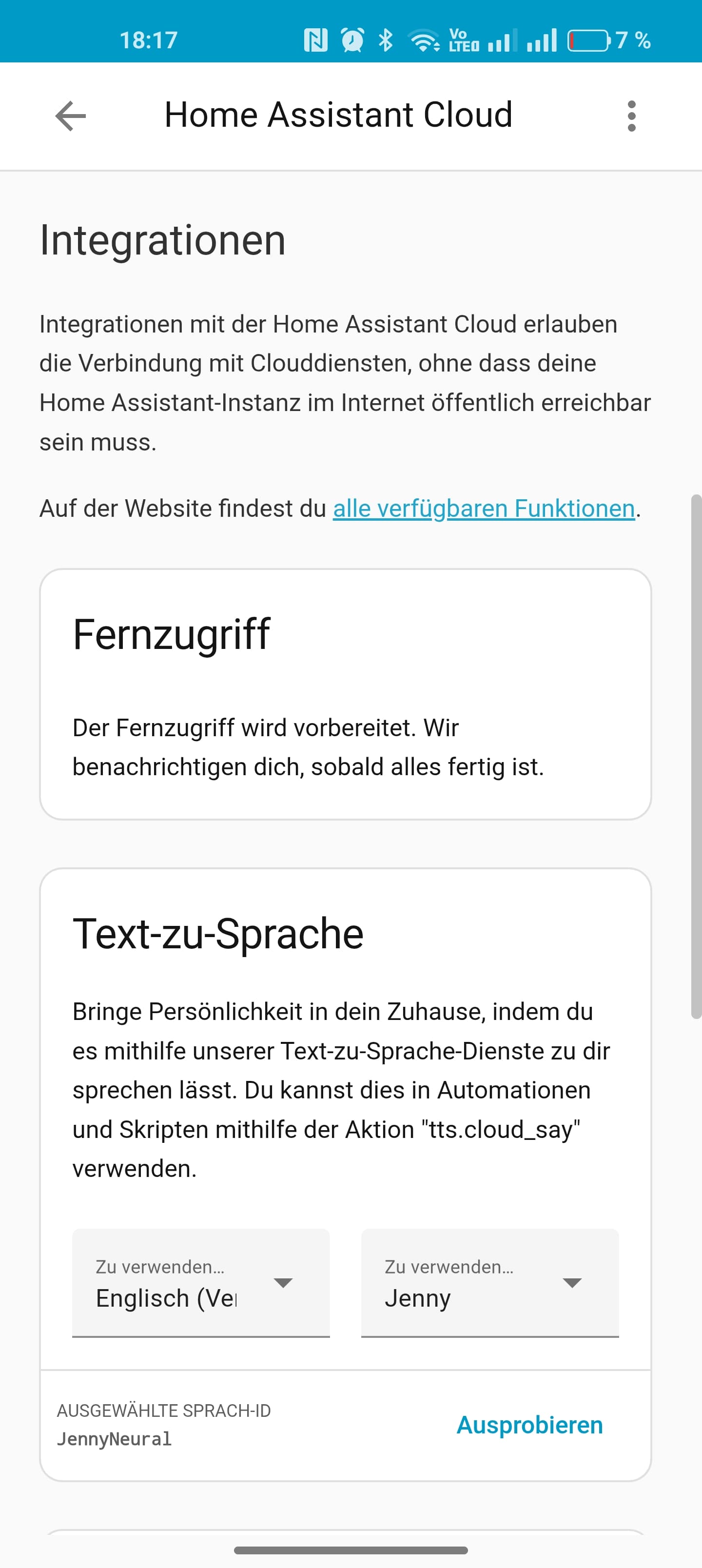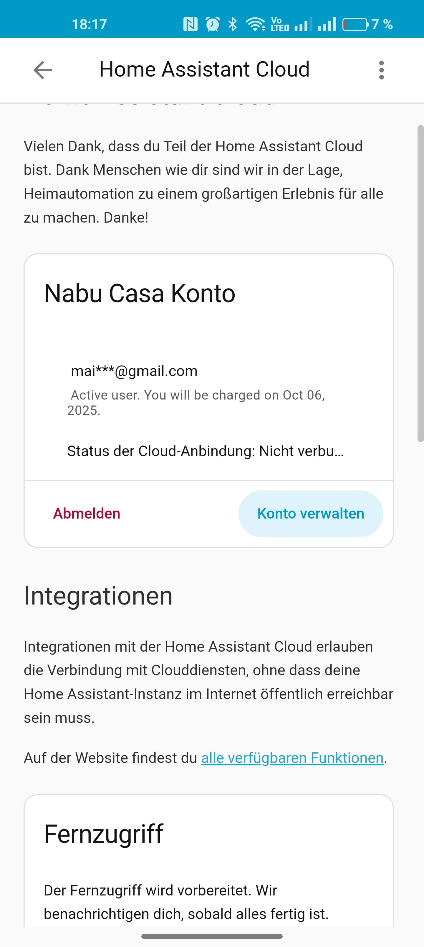 ich habe das Problem dass seit ca. 2 Wochen emin Fernzugriff über Nabu Casa nicht mehr funktioniert. Ich habe aber nichts geändert und wie es auf der Seite von Nabu Casa aussieht liegt es auch nicht an einem Zahlungs Problem mit meiner neuen Karte.