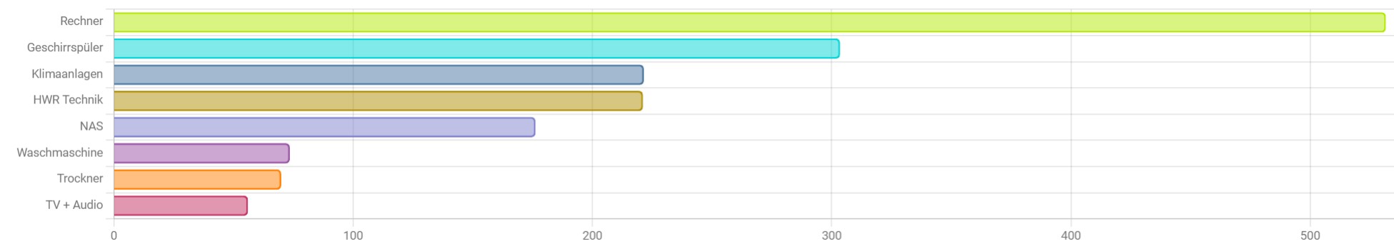PS: Die “TV & Audio” Gruppe habe erst seit ca. 4 Wochen und da wir täglich Musik hören oder auch TV schauen, ist die sicher höher. Und den Elektroherd habe ich noch nicht dabei. Der würde sicher ganz oben mit sein.