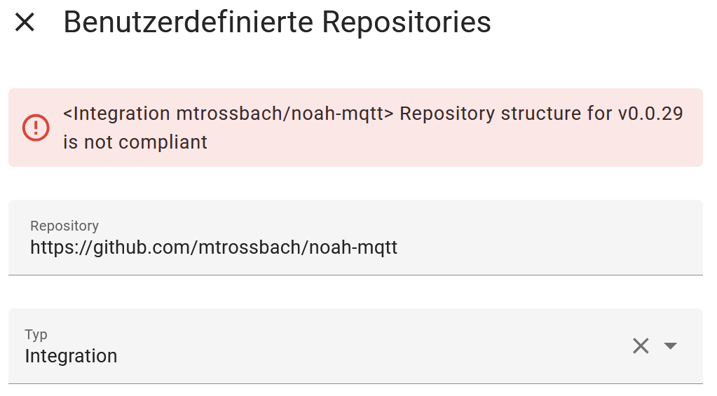 Nun wollte ich mal die Integration neu installieren (ein häufiger Tipp hier…), da bekomme ich schon beim Hinzufügen des Repositorys (nicht etwa “haben wir schon…”) das hier: