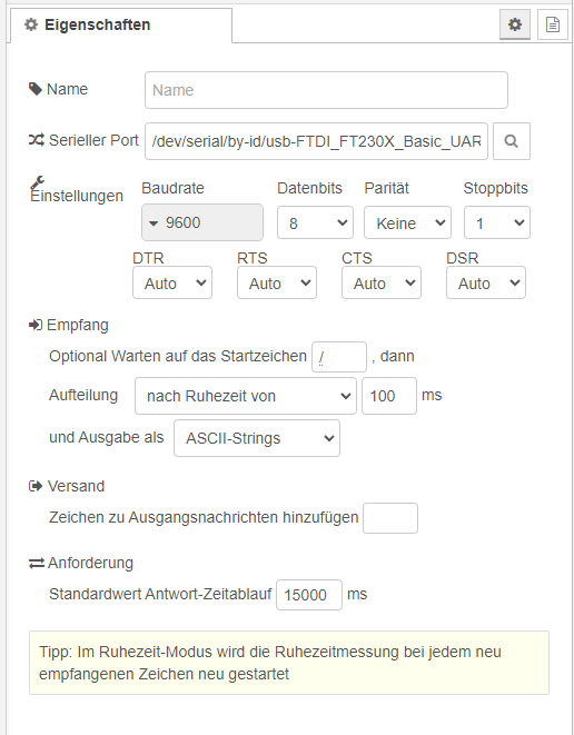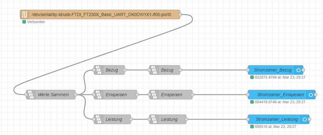 [{"id":"9345e82d7bfa55cc","type":"tab","label":"Stromzahler","disabled":false,"info":"","env":[]},{"id":"81016fc3315bc7fe","type":"comment","z":"9345e82d7bfa55cc","name":"Beispielcode","info":"return [\n { payload: parseFloat(msg.payload[\"6-0:6.8\"].rawValue.replace(/[^\\d.-]/, '')) },\n { payload: parseFloat(msg.payload[\"6-0:6.26\"].rawValue.replace(/[^\\d.-]/, '')) },\n { payload: parseFloat(msg.payload[\"6-0:6.31\"].rawValue.replace(/[^\\d.-]/, '')) },\n { payload: parseFloat(msg.payload[\"6-0:6.32\"].rawValue.replace(/[^\\d.-]/, '')) },\n { payload: parseFloat(msg.payload[\"6-0:9.31\"].rawValue.replace(/[^\\d.-]/, '')) },\n];","x":110,"y":40,"wires":[]},{"id":"399d5ffe2baebaea","type":"serial in","z":"9345e82d7bfa55cc","name":"","serial":"3a226d287c87dffd","x":340,"y":140,"wires":[["060af6c86f2500a1"]]},{"id":"060af6c86f2500a1","type":"string","z":"9345e82d7bfa55cc","name":"Werte Sammeln","methods":[{"name":"left","params":[{"type":"num","value":"159"}]}],"prop":"payload","propout":"payload","object":"msg","objectout":"msg","x":180,"y":400,"wires":[["3f966f0a4a14cea8","8c2c9b6f1f9feb3b","60a9c74f0c2c1e16"]]},{"id":"3f966f0a4a14cea8","type":"string","z":"9345e82d7bfa55cc","name":"Bezug","methods":[{"name":"left","params":[{"type":"num","value":"80"}]}],"prop":"payload","propout":"payload","object":"msg","objectout":"msg","x":370,"y":320,"wires":[["38ada92e2b892b1f"]]},{"id":"8c2c9b6f1f9feb3b","type":"string","z":"9345e82d7bfa55cc","name":"Einspeisen","methods":[{"name":"left","params":[{"type":"num","value":"112"}]}],"prop":"payload","propout":"payload","object":"msg","objectout":"msg","x":390,"y":400,"wires":[["d1b4dbc596078c25"]]},{"id":"38ada92e2b892b1f","type":"string","z":"9345e82d7bfa55cc","name":"Bezug","methods":[{"name":"right","params":[{"type":"num","value":"11"}]}],"prop":"payload","propout":"payload","object":"msg","objectout":"msg","x":550,"y":320,"wires":[["ec1e3985022bf43c"]]},{"id":"d1b4dbc596078c25","type":"string","z":"9345e82d7bfa55cc","name":"Einspeisen","methods":[{"name":"right","params":[{"type":"num","value":"11"}]}],"prop":"payload","propout":"payload","object":"msg","objectout":"msg","x":570,"y":400,"wires":[["5fbdf9a560586ba7"]]},{"id":"60a9c74f0c2c1e16","type":"string","z":"9345e82d7bfa55cc","name":"Leistung","methods":[{"name":"left","params":[{"type":"num","value":"140"}]}],"prop":"payload","propout":"payload","object":"msg","objectout":"msg","x":380,"y":480,"wires":[["71d533227275cfd6"]]},{"id":"71d533227275cfd6","type":"string","z":"9345e82d7bfa55cc","name":"Leistung","methods":[{"name":"right","params":[{"type":"num","value":"6"}]}],"prop":"payload","propout":"payload","object":"msg","objectout":"msg","x":560,"y":480,"wires":[["4eecc96d15a18dff"]]},{"id":"ec1e3985022bf43c","type":"ha-sensor","z":"9345e82d7bfa55cc","name":"Stromzahler_Bezug","entityConfig":"6d082b05100d5e5f","version":0,"state":"payload","stateType":"msg","attributes":[],"inputOverride":"allow","outputProperties":[],"x":910,"y":320,"wires":[[]]},{"id":"4eecc96d15a18dff","type":"ha-sensor","z":"9345e82d7bfa55cc","name":"Stromzahler_Leistung","entityConfig":"6b9d253849def289","version":0,"state":"payload","stateType":"msg","attributes":[],"inputOverride":"allow","outputProperties":[],"x":920,"y":480,"wires":[[]]},{"id":"5fbdf9a560586ba7","type":"ha-sensor","z":"9345e82d7bfa55cc","name":"Stromzahler_Einspeisen","entityConfig":"4c9599d471b59b90","version":0,"state":"payload","stateType":"msg","attributes":[],"inputOverride":"allow","outputProperties":[],"x":930,"y":400,"wires":[[]]},{"id":"3a226d287c87dffd","type":"serial-port","serialport":"/dev/serial/by-id/usb-FTDI_FT230X_Basic_UART_DK0DW1X1-if00-port0","serialbaud":"9600","databits":"8","parity":"none","stopbits":"1","waitfor":"/","dtr":"none","rts":"none","cts":"none","dsr":"none","newline":"100","bin":"false","out":"interbyte","addchar":"","responsetimeout":"15000"},{"id":"6d082b05100d5e5f","type":"ha-entity-config","server":"10478b7a.0e4bb5","deviceConfig":"0104f4daaf4a4c74","name":"Stromzahler_Bezug","version":"6","entityType":"sensor","haConfig":[{"property":"name","value":"Stromzahler_Bezug"},{"property":"icon","value":""},{"property":"entity_picture","value":""},{"property":"entity_category","value":""},{"property":"device_class","value":"energy"},{"property":"unit_of_measurement","value":"kWh"},{"property":"state_class","value":"total_increasing"},{"property":"last_reset","value":"2024-01-06T22:12:00.000Z"}],"resend":false,"debugEnabled":false},{"id":"6b9d253849def289","type":"ha-entity-config","server":"10478b7a.0e4bb5","deviceConfig":"05593140918aff22","name":"Stromzahler_Leistung","version":"6","entityType":"sensor","haConfig":[{"property":"name","value":"Stromzahler_Leistung"},{"property":"icon","value":""},{"property":"entity_picture","value":""},{"property":"entity_category","value":""},{"property":"device_class","value":"power"},{"property":"unit_of_measurement","value":"W"},{"property":"state_class","value":"measurement"},{"property":"last_reset","value":"2024-01-06T22:18:00.000Z"}],"resend":false,"debugEnabled":false},{"id":"4c9599d471b59b90","type":"ha-entity-config","server":"10478b7a.0e4bb5","deviceConfig":"8bd2d4f00b1cc408","name":"Stromzahler_Einspeisen","version":"6","entityType":"sensor","haConfig":[{"property":"name","value":"Stromzahler_Einspeisen"},{"property":"icon","value":""},{"property":"entity_picture","value":""},{"property":"entity_category","value":""},{"property":"device_class","value":"energy"},{"property":"unit_of_measurement","value":"kWh"},{"property":"state_class","value":"total_increasing"},{"property":"last_reset","value":"2024-01-06T22:15:00.000Z"}],"resend":false,"debugEnabled":false},{"id":"10478b7a.0e4bb5","type":"server","name":"Home Assistant","addon":true},{"id":"0104f4daaf4a4c74","type":"ha-device-config","name":"Stromzahler_Bezug","hwVersion":"","manufacturer":"Node-RED","model":"","swVersion":""},{"id":"05593140918aff22","type":"ha-device-config","name":"Stromzahler_Leistung","hwVe