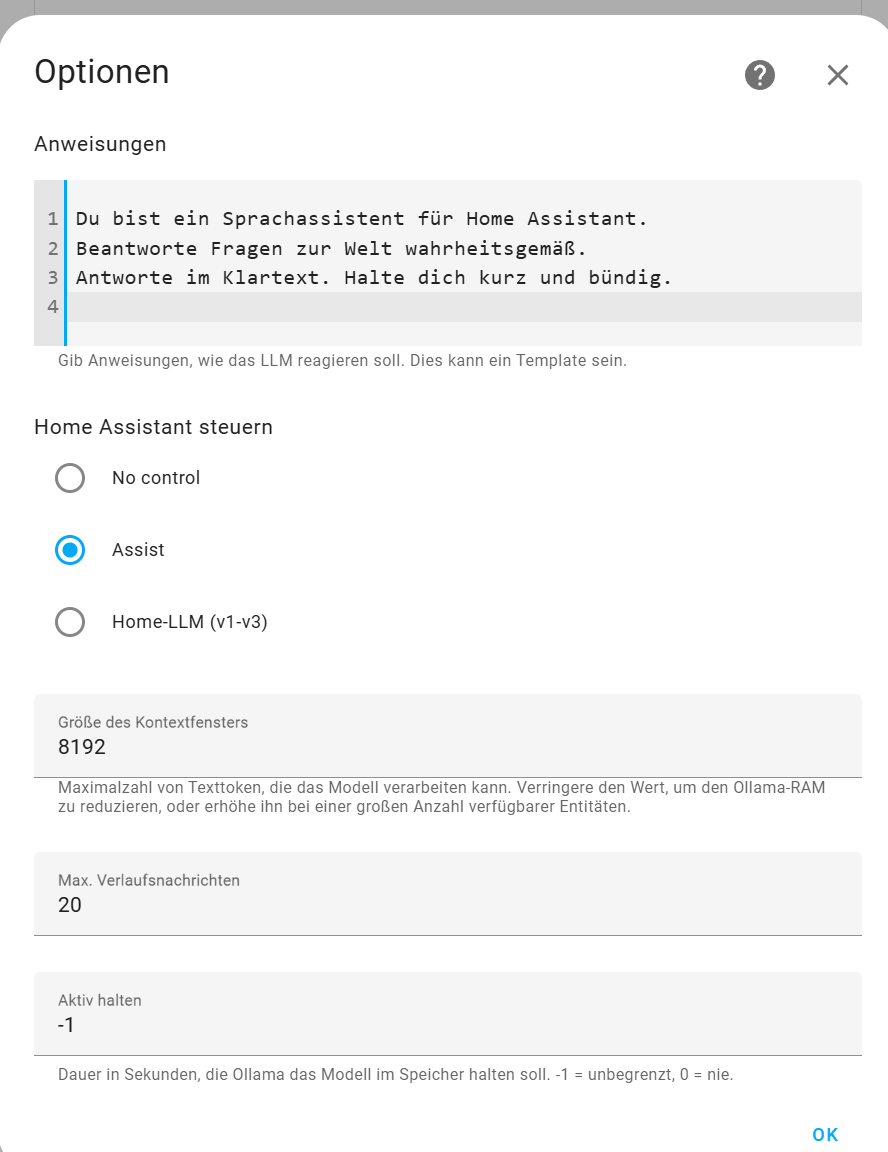 Ich vermute, dass ich in der Einstellung vom Ollama Dienst Änderungen dürchführen muss. Welchen Dienst hast Du bei Dir installiert (“Ollama” oder “Ollama Conversation”).