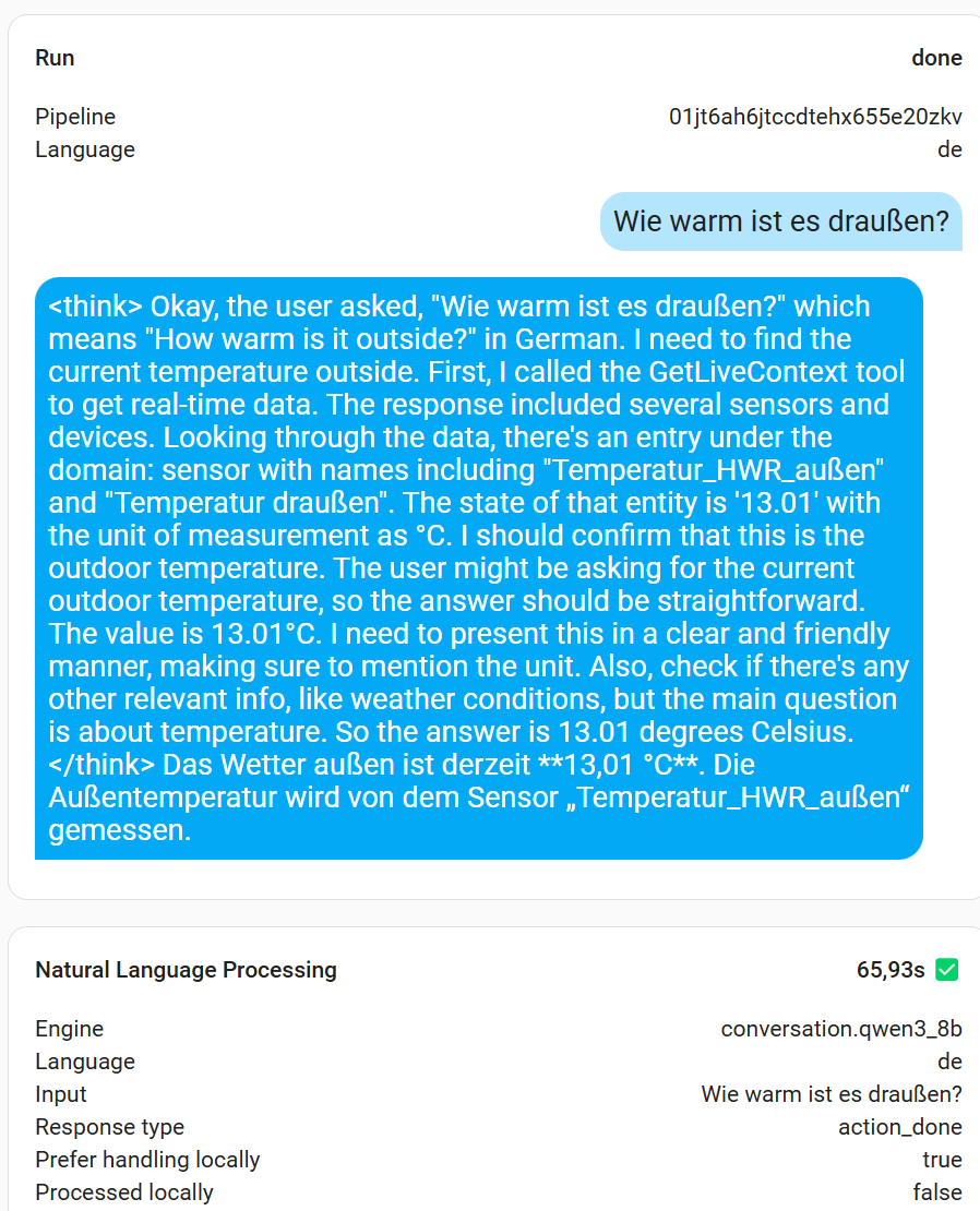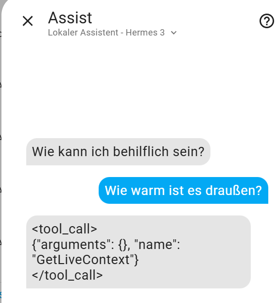 Hermes ist in Summe nicht schlecht. Reagiert sehr flott und antwortet schön. Was mich wundert ist, dass GoogleKI Aufgaben vgl. “Stelle das Rollo auf 50%” ohne Mucken durchführt. Die lokalen Modelle hier mit Unwissenheit antworten - z.B.: “Entschuldigung, aber ich habe ein Problem bei der Ausführung deines Kommandos. Könnten Sie bitte die Informationen präzisieren?” - Direktes Öffnen und schleißen klappt hingegen problemlos. Hier stelle ich mir die Frage, ob daran das Model oder die genutzte Integration schuld ist.