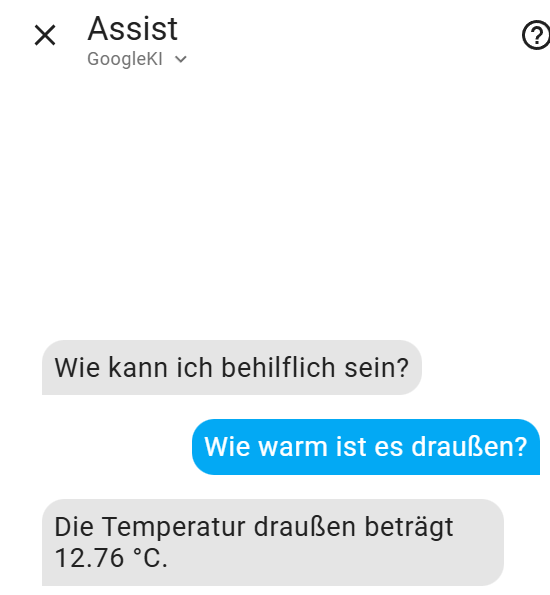 Wenn ich auf den GoogleAI wechsele, läuft die Assist-Funktion (recht) problemlos. ich kann Sensoren abfragen und Geräte steuern (30 freigegebene Entitäten mit entsprechenden Aliase)