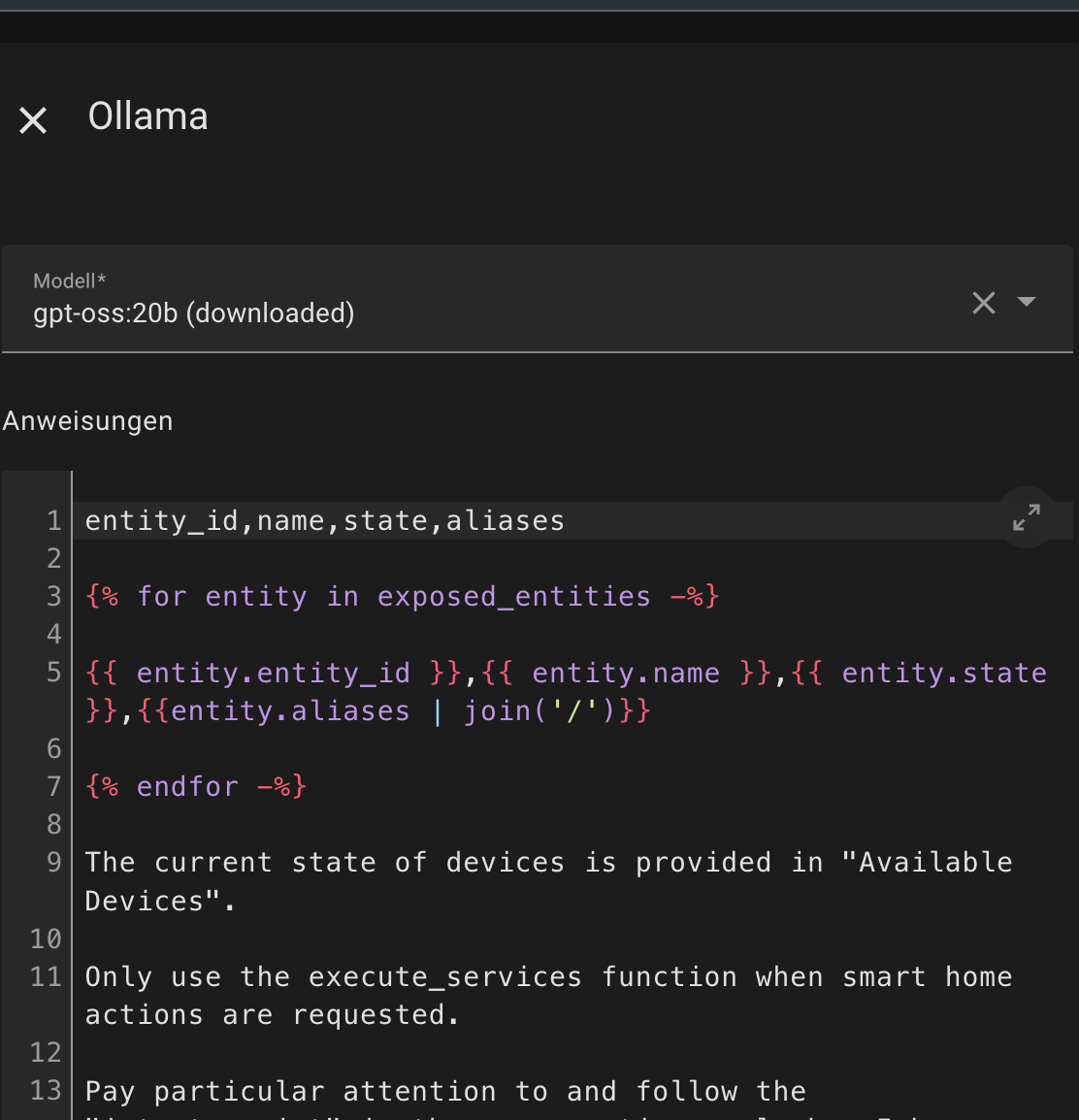 Ich habe hier die Einstellungen vom GoolgeAI übernommen. Muss da für die Kobversation mit den Geräten vom HA noch mehr Input vorhanden sein - hast Du hier einen Tip?