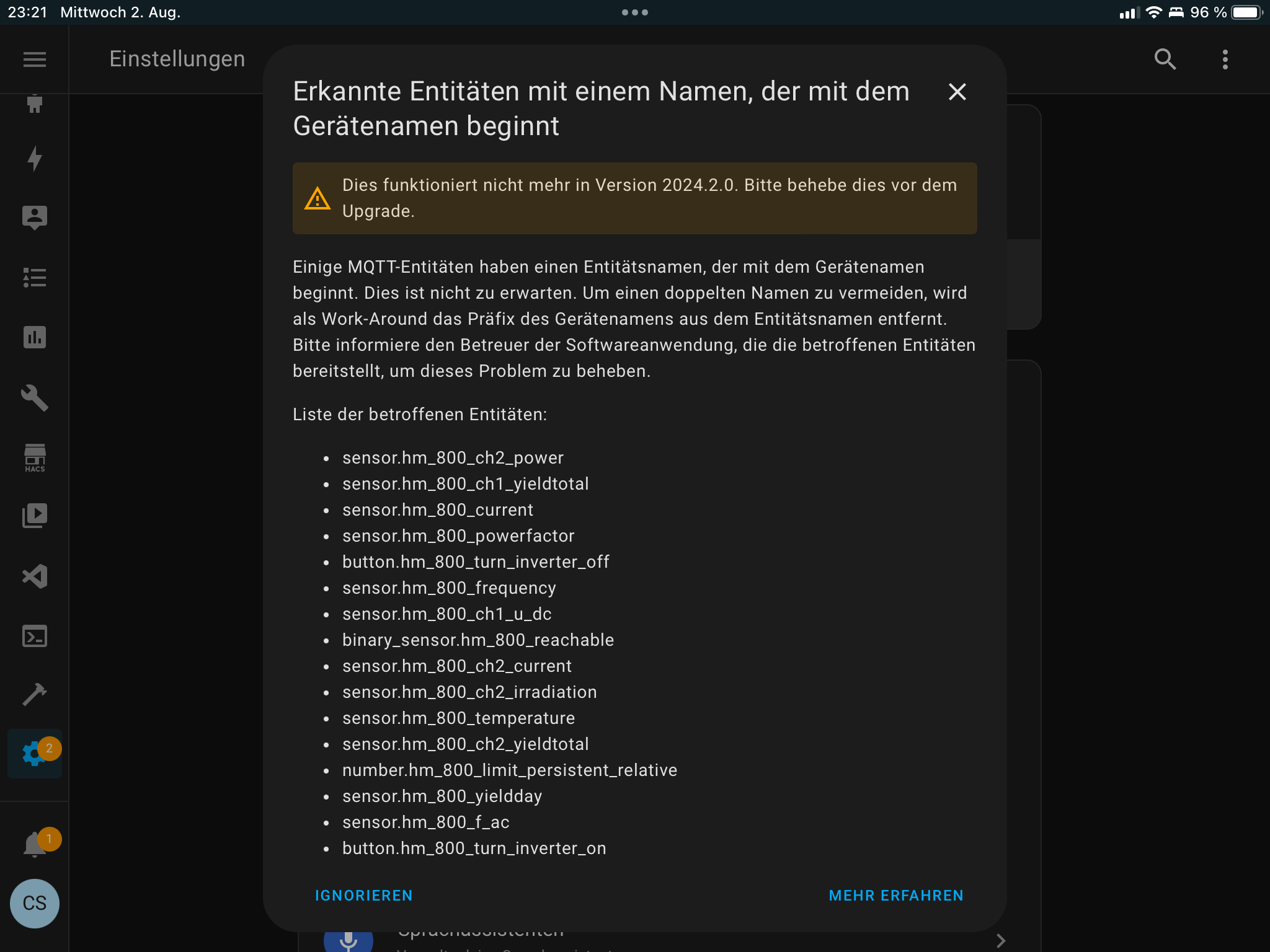 eingestellt. Die Entitys werden also in HA automatisch erkannt und angelegt. Nun habe ich nach dem HA Update gestern auf 2023.08 folgende ReparaturMeldung bekommen.