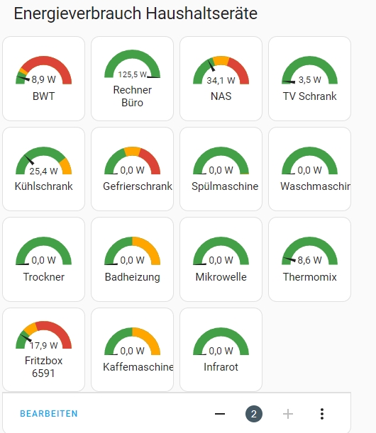 ich habe mir das Dashboard neu angelegt und die Verbrauchswerte aller smarte Steckdosen als Pegelanzeigen angelegt. Das ist alles noch sehr experimentell. Nun würde mich interessieren, ob ich irgendwie auch eine Anzeige für den momentanen Gesamtverbrauch aller Geräte visualisiert bekomme - quasi alle Entitäten vereint in einem Pegel o. ä.?