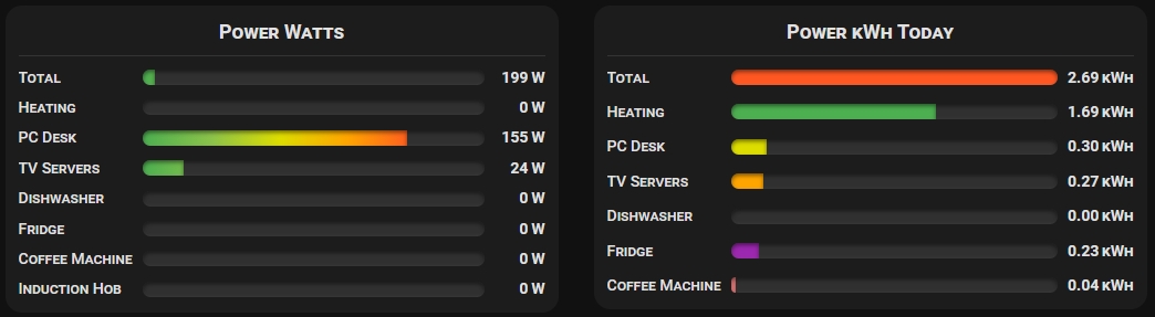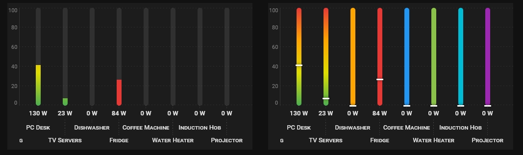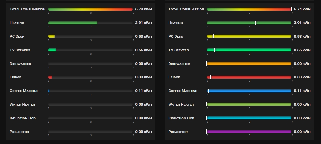 Piotras Value Bar eignet sich hervorragend als Energiemonitoring-Dashboard. Die Kombination aus dynamischem max, Farbverläufen und dem show_indicator-Pin liefert sofortiges visuelles Feedback zum Stromverbrauch.