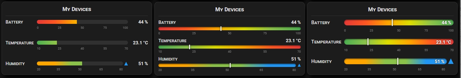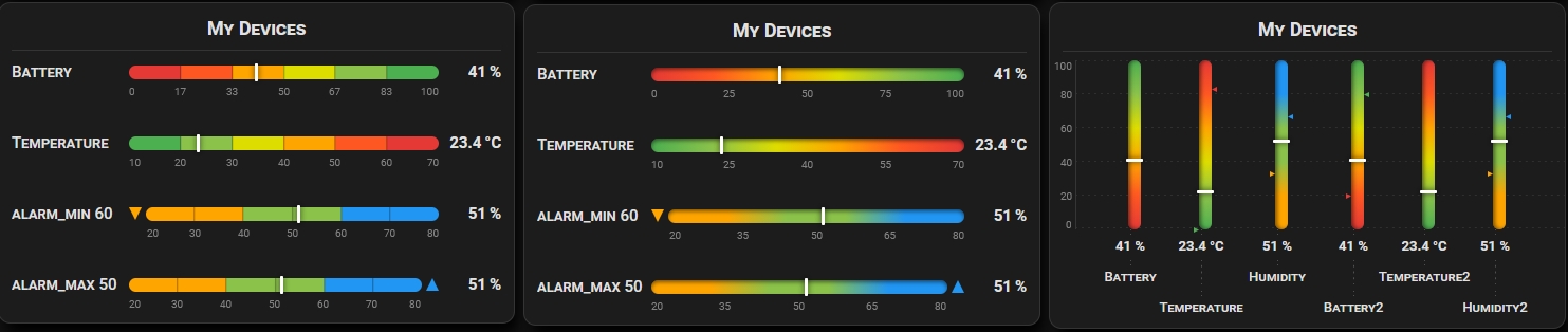 - Unabhängiger Min/Max-Bereich pro Gerät — Einheiten frei mischen (%, °C, W, kWh)