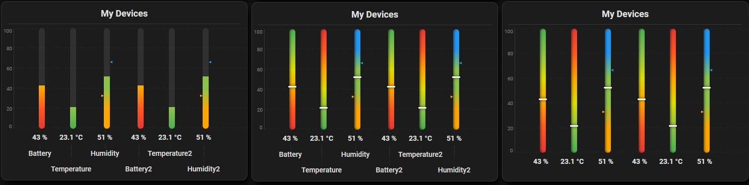 Alle Geräte als vertikale Balken nebeneinander mit gemeinsamer Basislinie. Eine Skalen-Spalte links zeigt Referenzwerte mit horizontalen gestrichelten Rasterlinien. Balken füllen sich von unten nach oben — perfekt zum Vergleichen mehrerer Sensoren auf einen Blick.
