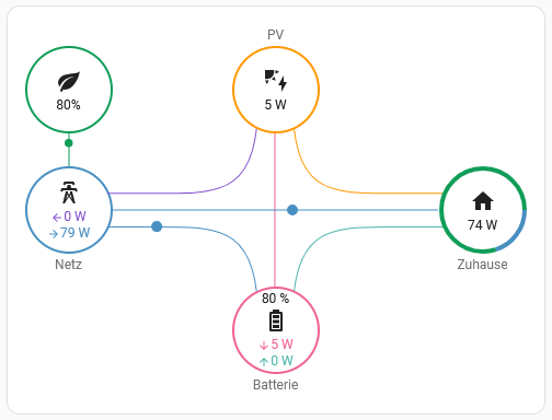 In diesem Beispiel sieht man es gut: Der aktuelle Netzbezug beträgt 79 Watt, so viel verbraucht auch das Zuhause. Vom Zuhause-Verbrauch werden jedoch die momentanen 5 Watt PV-Leistung abgezogen. Bei der Batterie stehen ebenfalls 5 Watt, aber der Fluss für die 5 Watt kommt vom Netzbezug statt von der PV?!