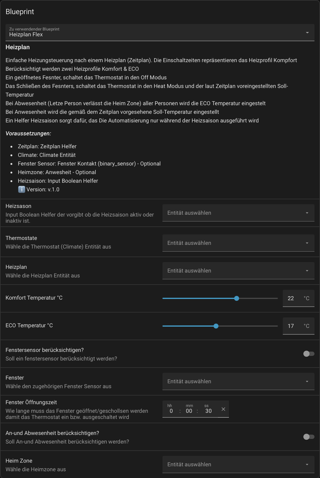 Ein einfaches Blueprint für die Heizung, stammt aus meiner Feder. Mit Fenster Erkennung, Anwesenheit und einem Zeitplan für die Komfort und Eco Temperatur.
