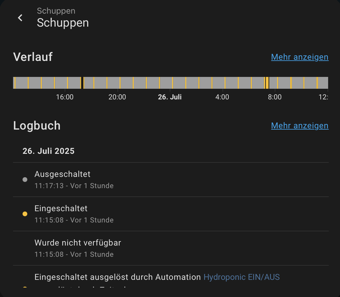 Soweit funktioniert das auch in HA und ich habe eine Automation erstellt, wo ein Gerät jede Stunde für 5 Minuten eingeschaltet werden soll. Das Einschalten klappt auch immer aber manchmal wird einfach nicht ausgeschaltet und ich weiss nicht warum.