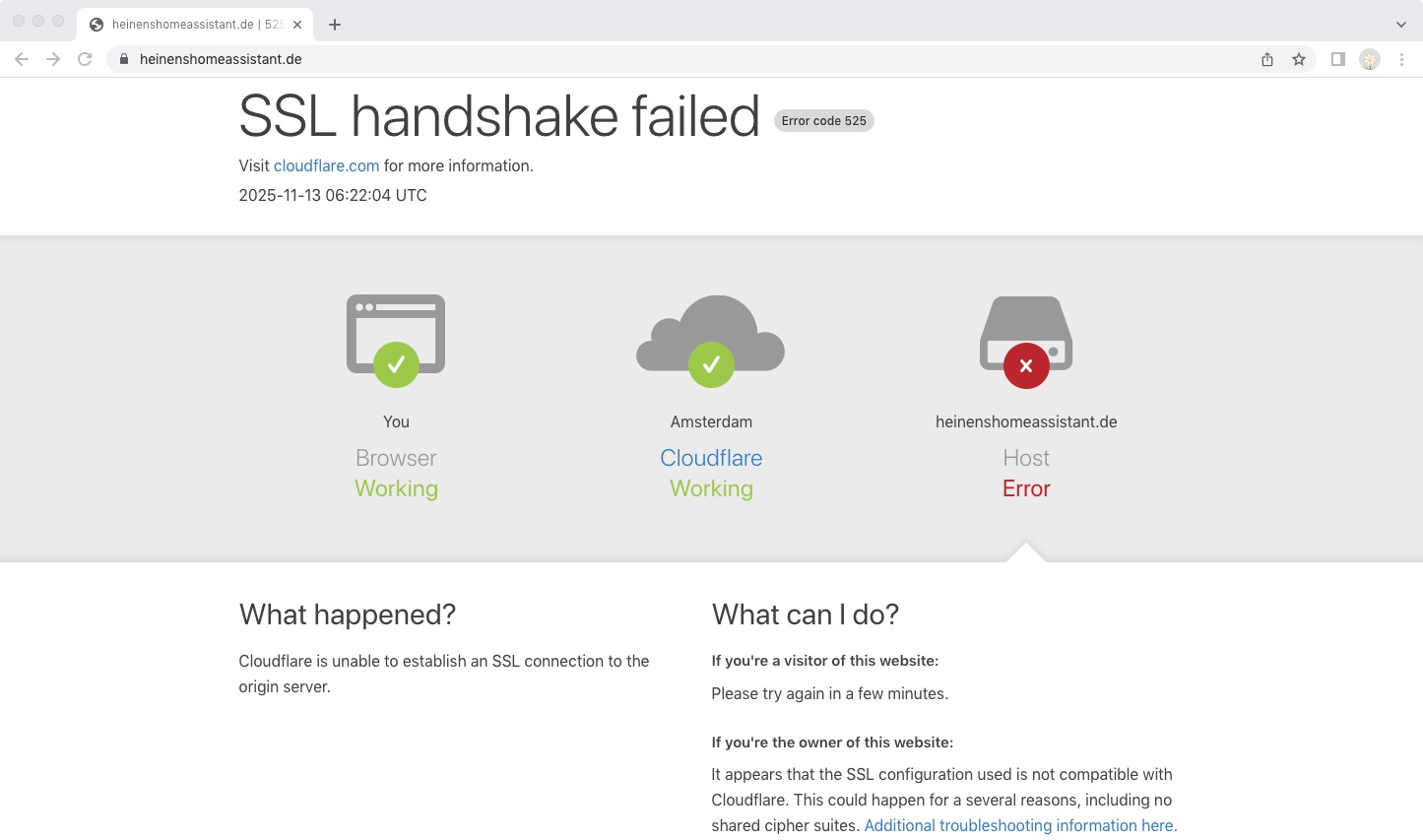 Wenn ich jetzt meine Homeassistant-Seite aufrufe, kommt folgende Fehlermeldung von Cloudflare: