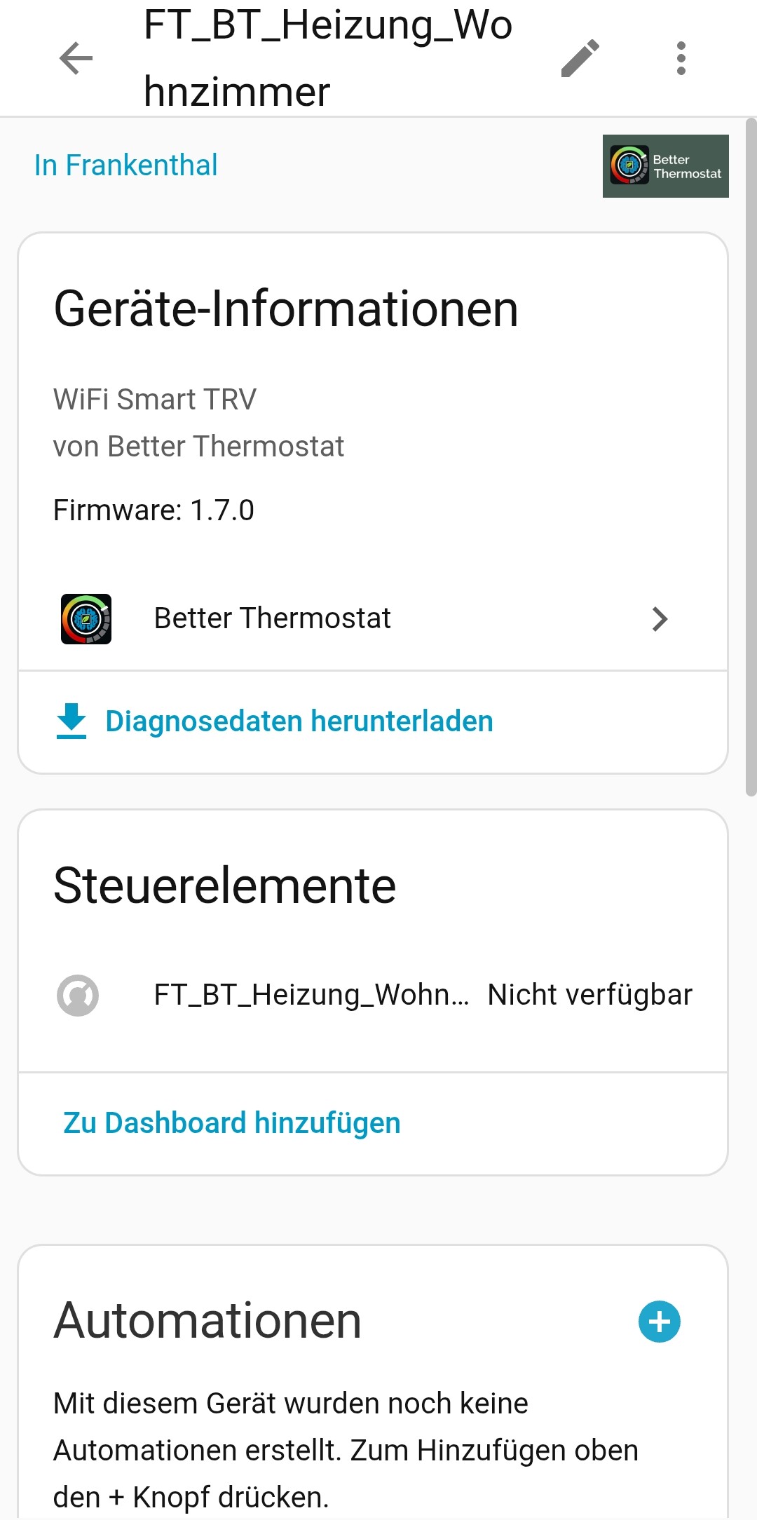 Okay gerne. Ich habe die Thermostate erfolgreich in HA eingebunden. Ich habe Better Thermostat installiert. Da gab es auch keine Probleme. Dann habe ich gemäß der Anleitung (Video von Simon42) ein Thermostat eingebunden. Und dann kam eben als Ergebnis dieses “Nicht verfügbar”. Vorher war alles in Ordnung