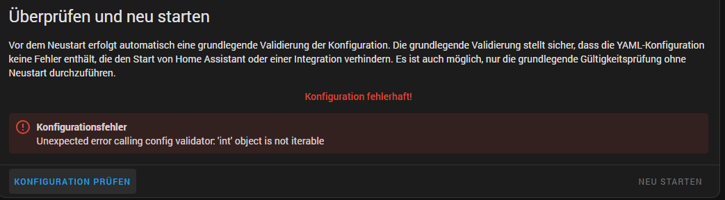 ich habe heute ein paar Updates installiert unter anderen das Core Update auf Version 2024.2. Außerdem habe ich die Blaupause für ADVANCED HEATING CONTROL aktualisiert. Seit dem habe ich das Problem das ich keine Automatisierungen mehr speichern kann. Es kommt keine Fehlermeldung sondern die neue Autoamatisierung erscheint nicht in der Übersicht. Jetzt wollte ich Home Assistant neu starten, bin wie immer noch mal auf Konfiguration prüfen gegangen und erhalte nun diesen Fehler: