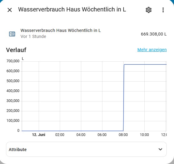 Dann habe ich mir zwei Helfer angelegt, dieses sollen dann von der umgerechneten Entität den Verbrauch zählen und Täglich bz. Wöchentlich zurücksetzen.
