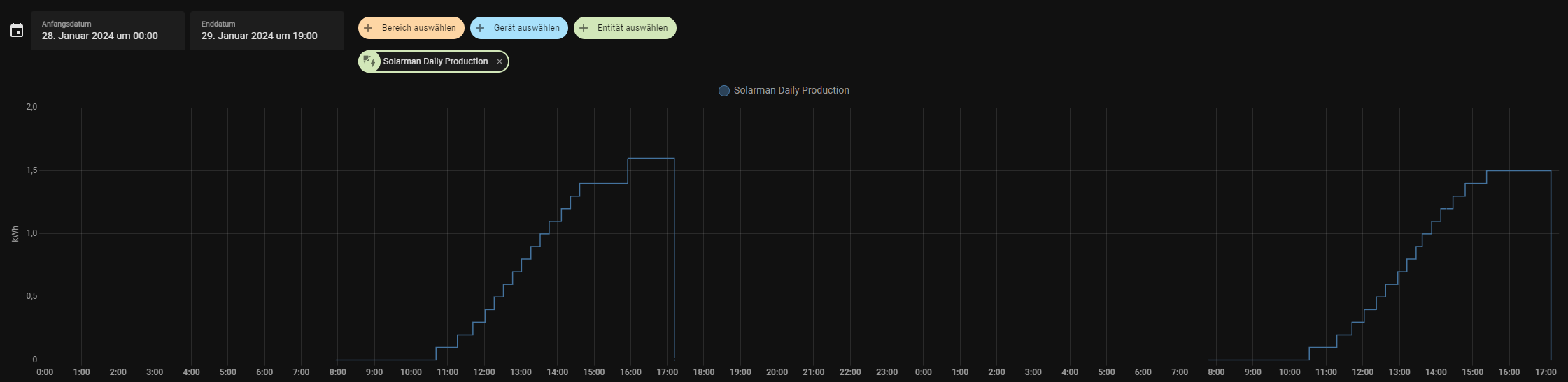 Die Entität “Solarman Daily Production” zeichnet über den Tag fleißig die erzeugten Kilowattstunden auf, aber sobald das Balkonkraftwerk offline geht, wird dieser Wert irgendwie auf null gesetzt und entsprechend vom Energiedashboard abgezogen.