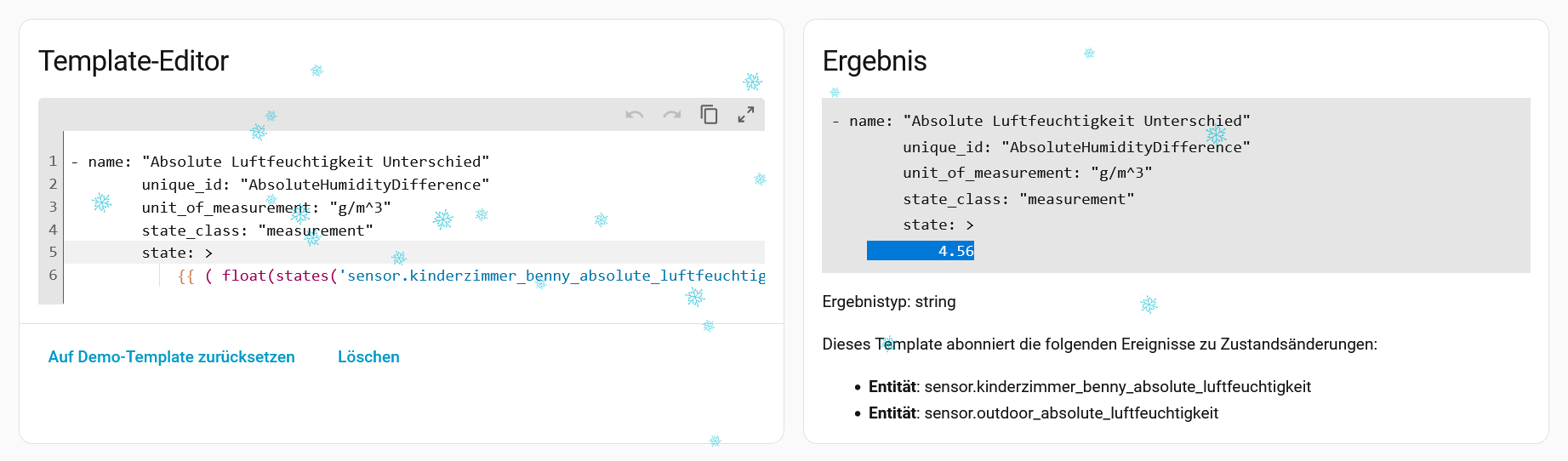 ich möchte 2 Luftfeuchtigkeitssensoren differenzieren in einem neuen Sensor als Differenz erfassen. Im Template Editor als Test kommt der Wert zurück und wird angezeigt!