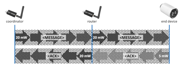 Sprich Du hast dann zwar zwischen dem Coordinator und dem Dongle als Router, die max. möglichen 20 mW, aber für die Verbindung von dem Endgrät zu dem Dongle als Router bringt das nichts. D.h. nicht mehr und nicht weniger als wenn da ein z.B. ein Plug als Router zum Einsatz käme.