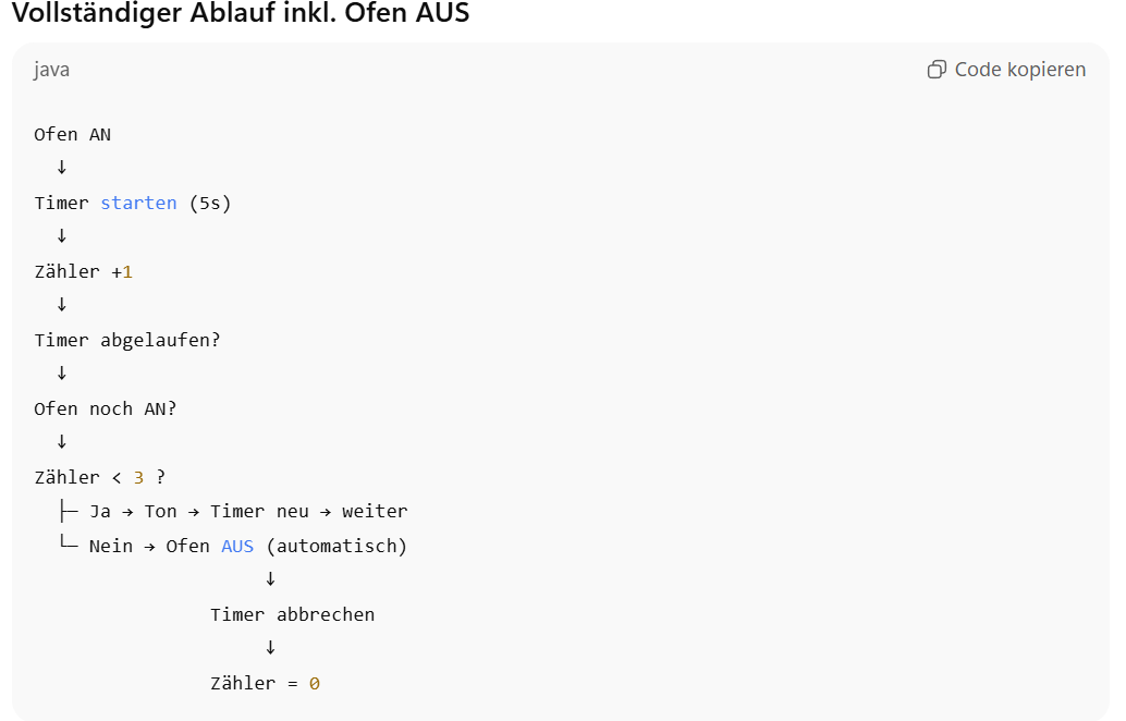 • Nach zwei Stunden wird dieser Loop abgebrochen, die „Ausschalt‑Sequenz“ läuft: letzte Nachricht + Herd ausschalten.
