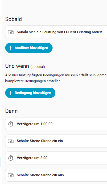 • Das wiederholt sich, bis binary_sensor.herd auf off geht oder die Automation durch den zweiten Trigger neu gestartet wird.