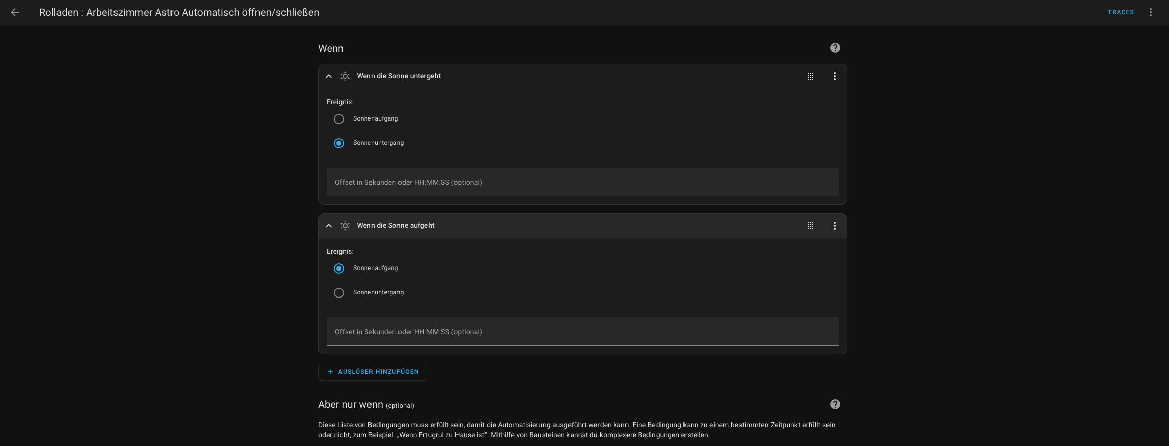 Ich habe eine einfache Automation erstellt, diese soll die Rolladen im Zimmer bei Sonnenuntergang schließen und bei Sonnenaufgang öffnen.