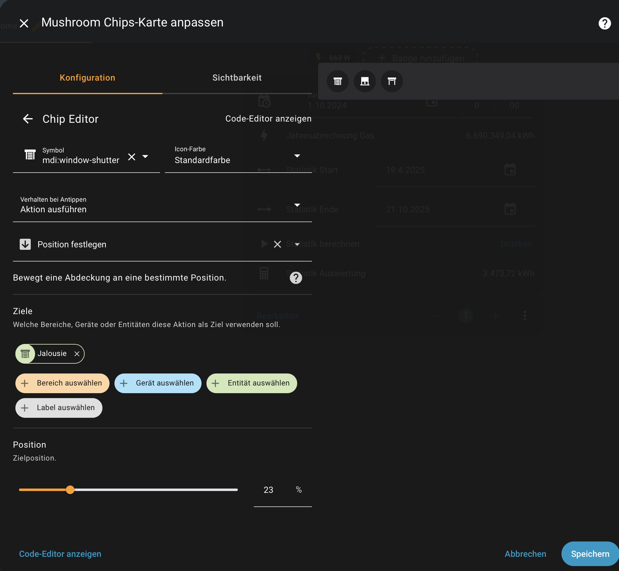 Ich möchte jetzt noch eine Dashboard Kachel anlegen, die mein Rollo auf 3 Standart Positionen fährt. Offen, 23% (ist bei meinem Rollo soweit geschlossen das es auf der Fensterbank aufliegt) und komplett geschlossen. Alles dazwischen wäre mir erstmal egal.