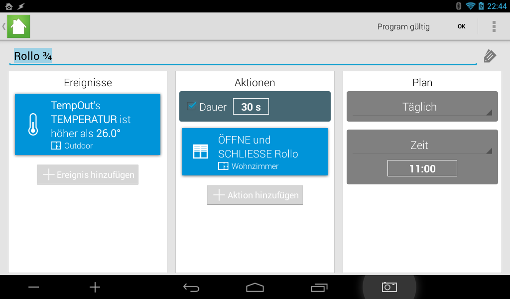 Ergebnis: ein bereits geöffneter Rollo bekommt nochmals den Befehl zum Öffnen (was keine Auswirkung hat) aber nach 30 Sekunden den Befehl zum Schliessen (was den Rollo dann stopp)